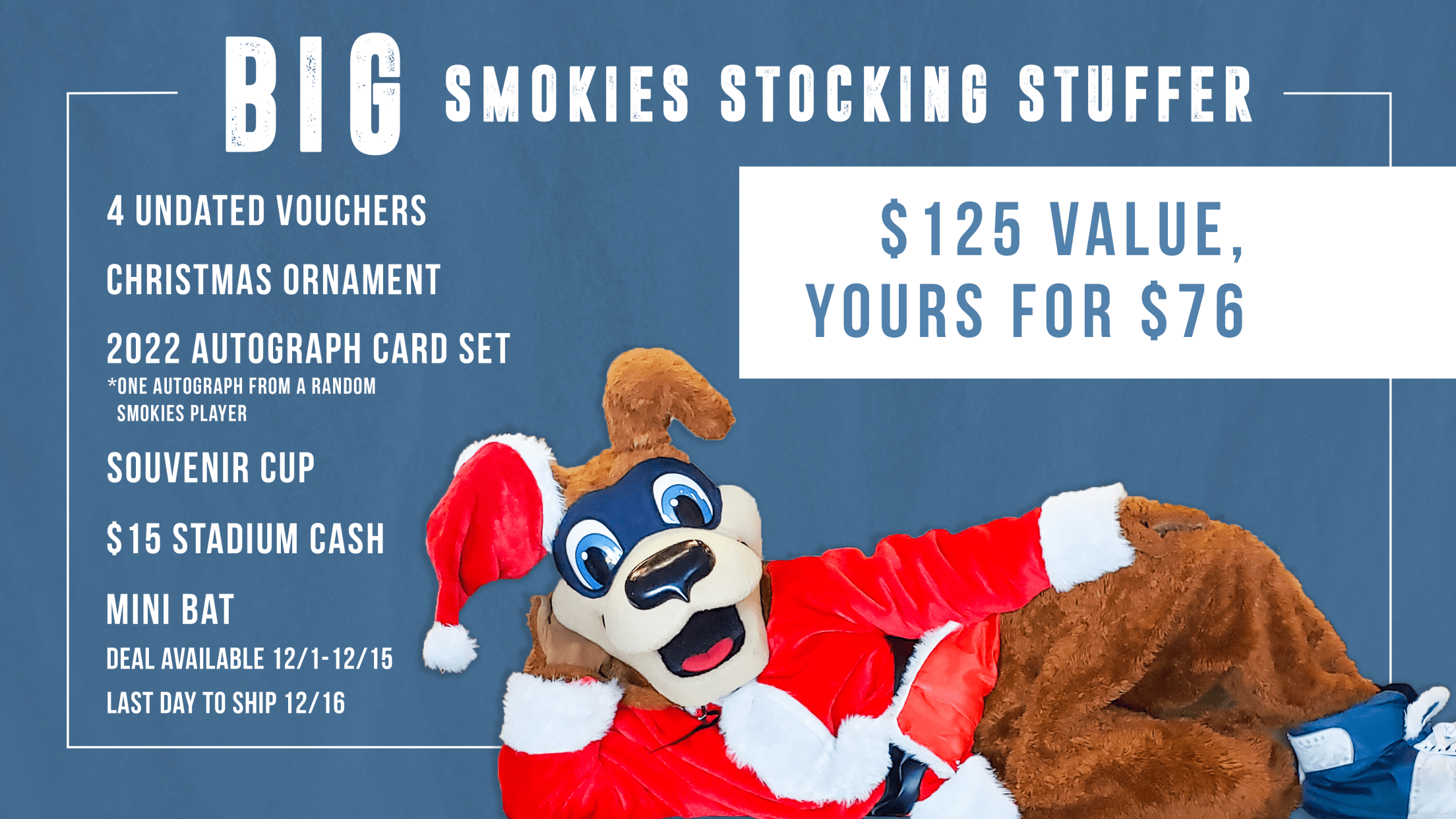 Our BIG Smokies Stocking Stuffer features four (4) undated tickets for the 2023 season, Smokies Christmas ornament, 2022 Smokies team card set with one guaranteed autograph, Smokies souvenir cup, mini bat, and $15 in stadium cash! A $125 value for just $76. Deal available now through 12/15/22.
