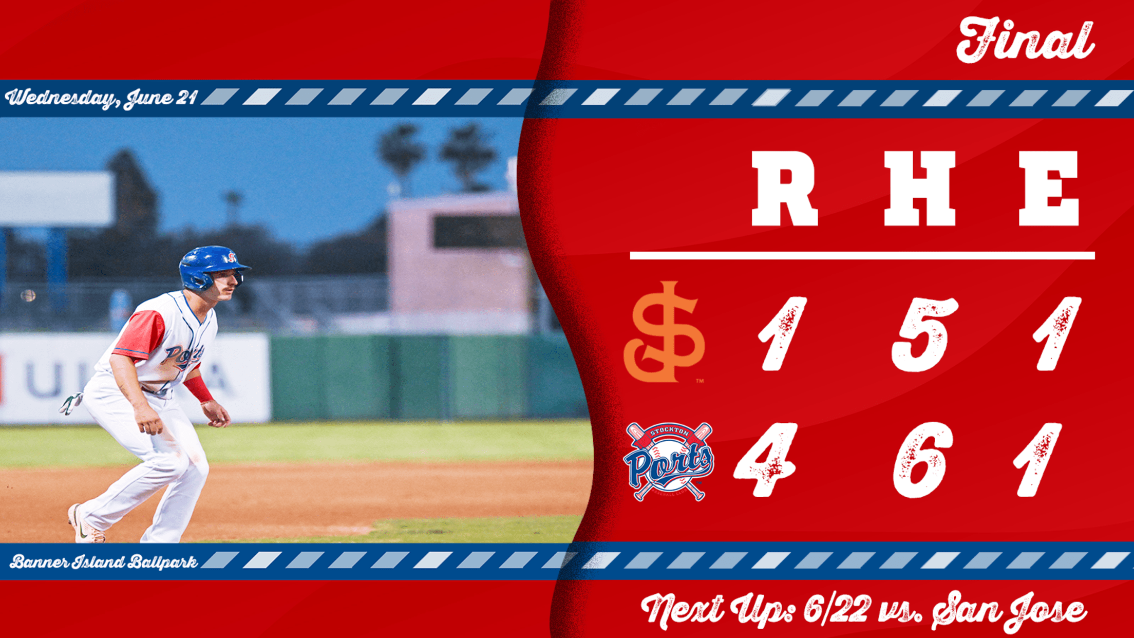 STOCKTON, CA – The Stockton Ports (25-40) tied a season-long winning streak by capturing their fourth victory in a row on Tuesday night, besting the San Jose Giants (39-26) at Banner Island Ballpark, 4-1.