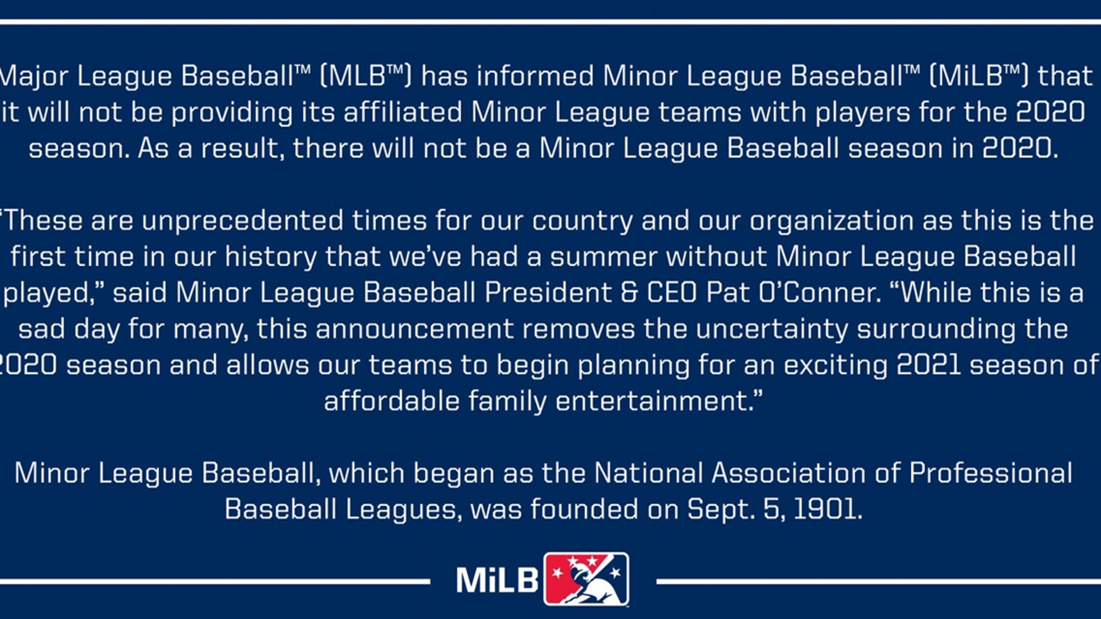 Minor League Baseball (MiLB) has officially canceled the 2020 Minor League Baseball season. Pat O’Connor, Minor League Baseball President issued the following statement today: “Major League Baseball™ (MLB™) has informed Minor League Baseball™ (MiLB™) that it will not be providing its affiliated Minor League teams with players for the 2020