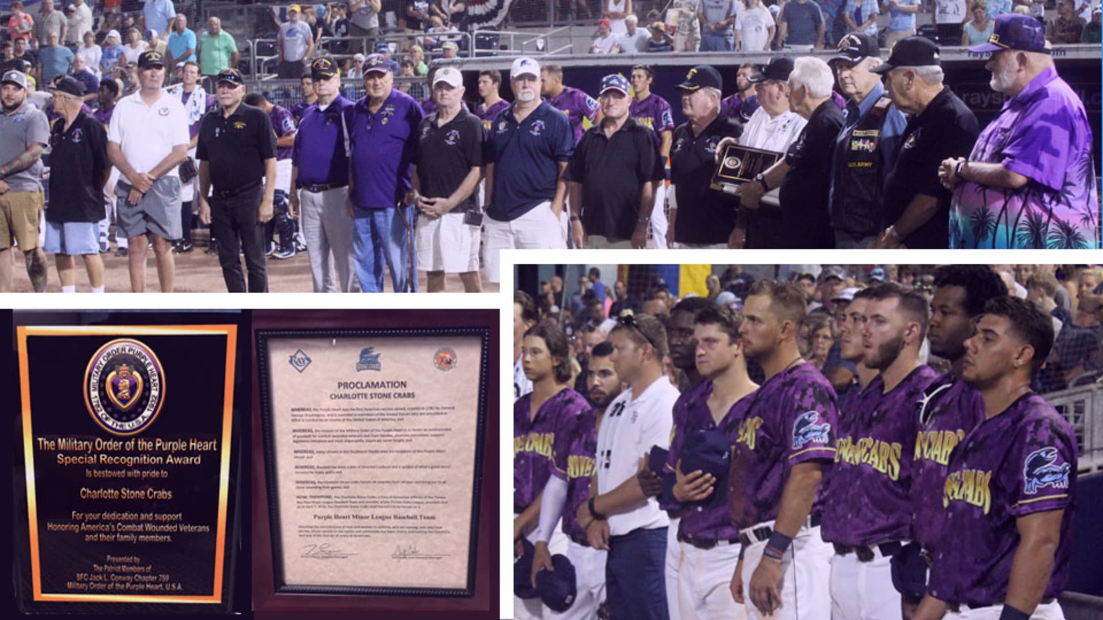On Opening Night, the Stone Crabs brought twenty Purple Heart recipients to the field during the middle of the 7th inning for recognition. As part of the celebration the Military Order of the Purple Heart, U.S.A Chapter 759 honored the Stone Crabs with a special recognition award and made a Proclamation declaring the Stone Crabs as an official Purple Heart Minor League Baseball Team.