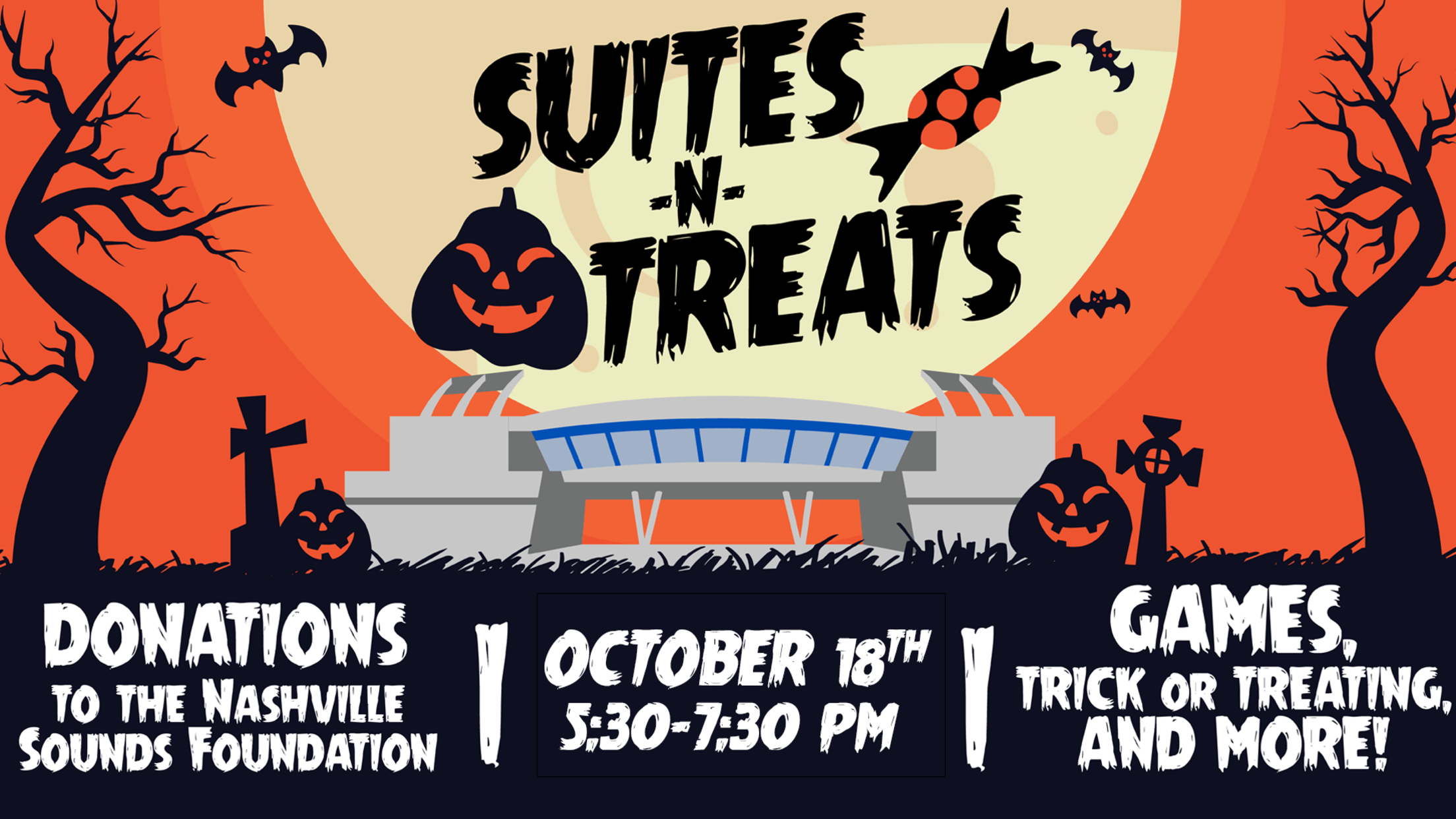 NASHVILLE – The Nashville Sounds Foundation is excited to announce the return of its kid-friendly, Halloween-themed Suites-N-Treats event at First Horizon Park on Wednesday, October 18 from 5:30-7:30 p.m.