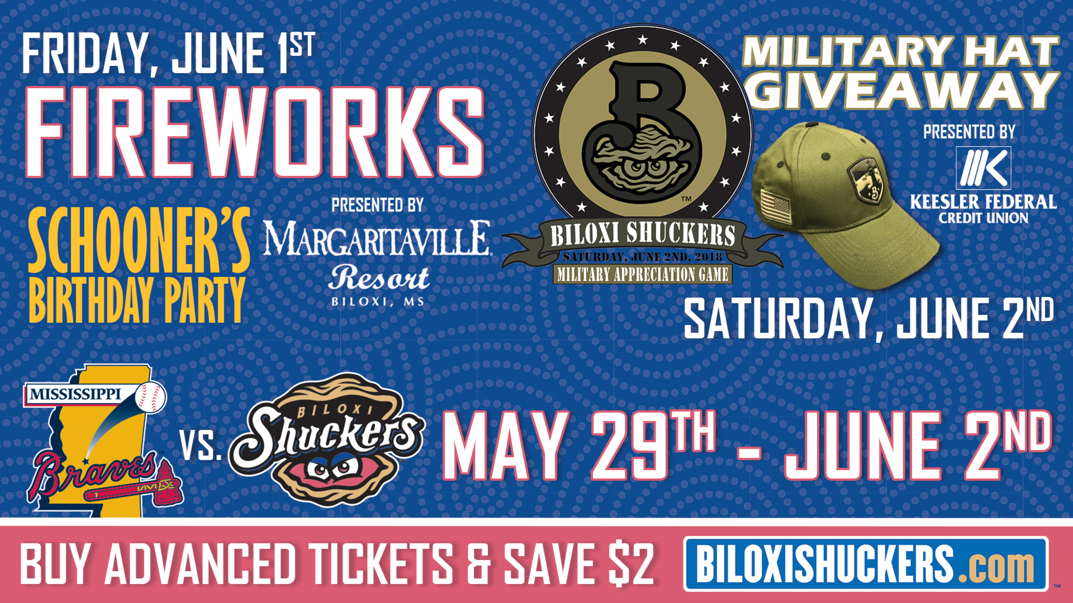 Following the start of summer over Memorial Day Weekend, the Biloxi Shuckers return to MGM Park for a five-game series against the Mississippi Braves that features a 'Gray Out' for a cause, a day to honor our armed forces and a full schedule of weekly promos. It is one of