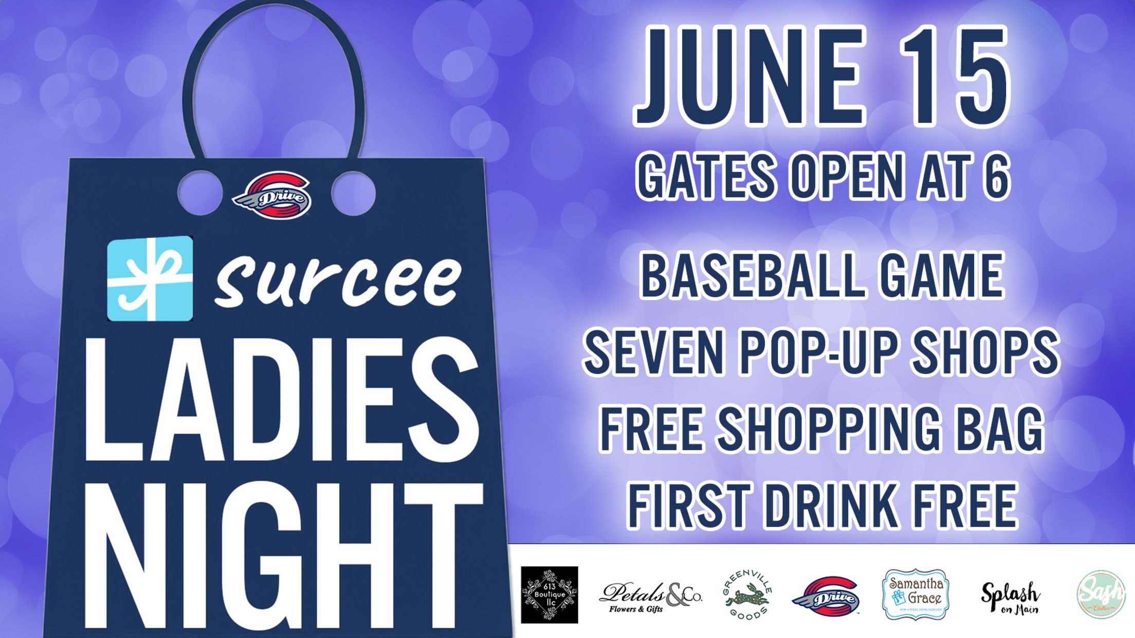 Join Surcee and the Greenville Drive for a ladies night like no other! On June 15, for $15, get admission to the game, opportunities to shop local pop-up shops on the Fluor Field concourse, and a complimentary first drink! Oh, and the first 100 ladies to check in will get a clear shopping tote bag!