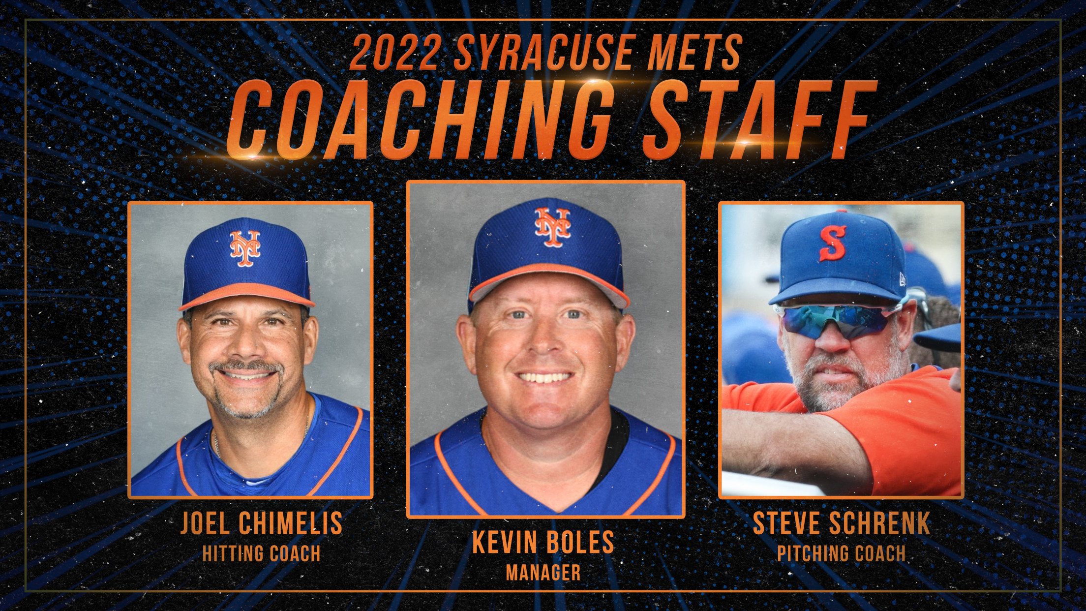 SYRACUSE, NY – The 2022 Syracuse Mets coaching staff has been announced and features three returning staff members and five new ones. Manager Kevin Boles will lead Syracuse for the first time, while Hitting Coach Joel Chimelis is returning to Syracuse for his third season and Pitching Coach Steve Schrenk