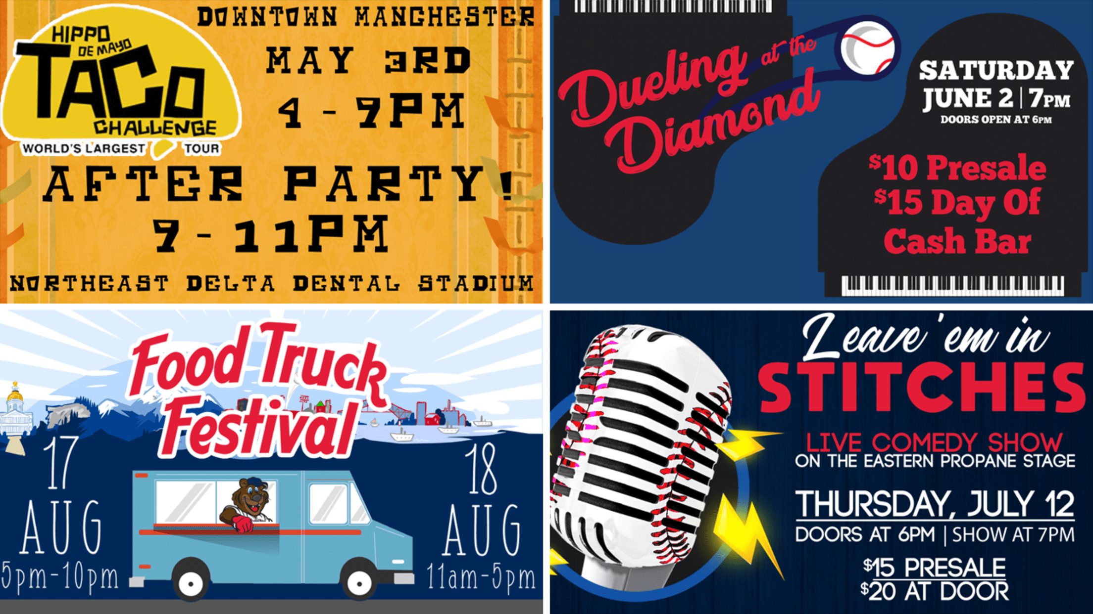 Thursday, May 3 - Taco Tour & After Party: The Fisher Cats will be one of the many stops featured in Manchester's "Hippo de Mayo" Taco Tour on Thursday, May 3 from 4 - 9 p.m., and the team will host an after party at the ballpark from 9 - 11 p.m. Guests can enjoy live music, drink specials, and yes, more tacos.
