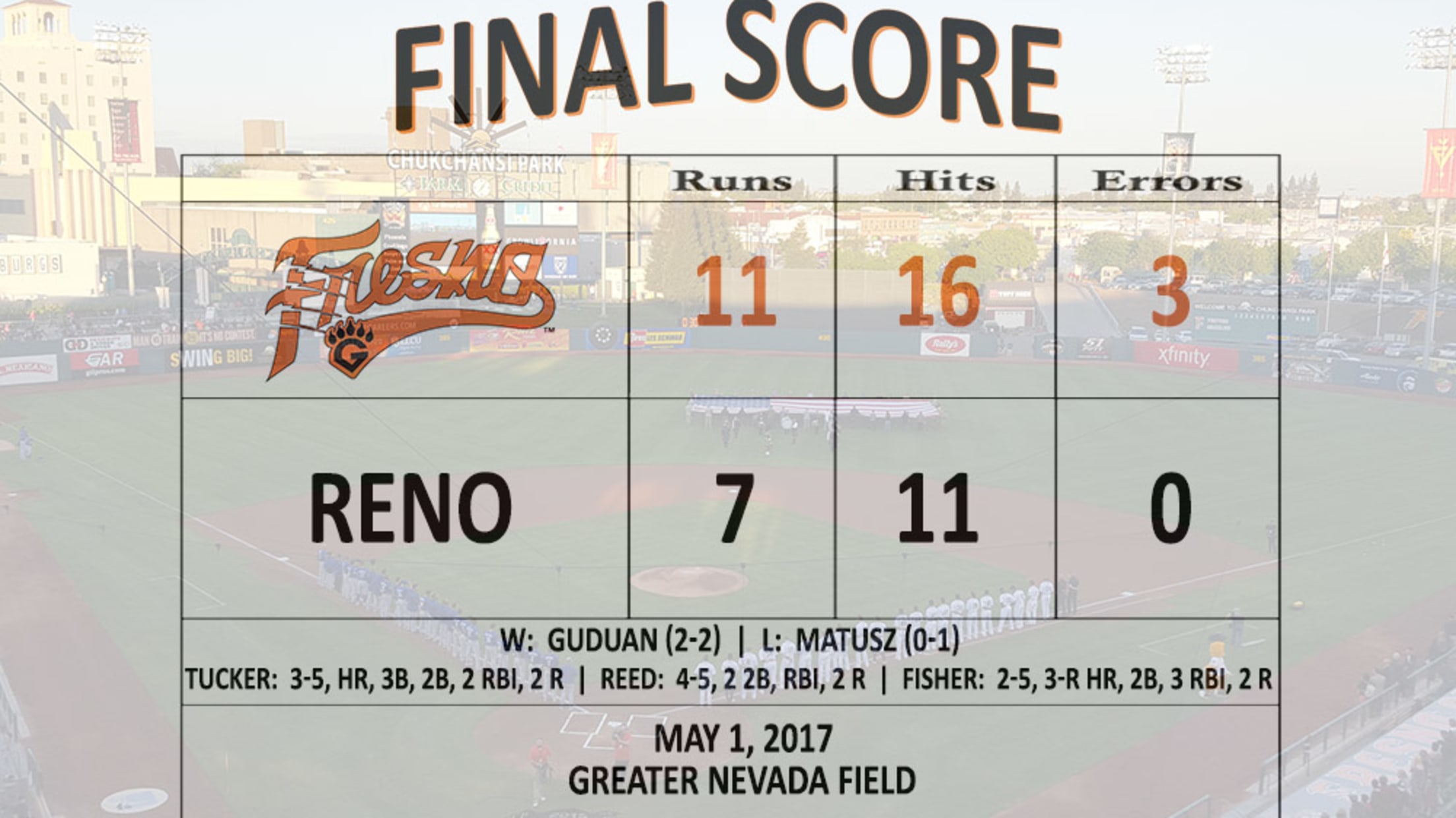 The Fresno Grizzlies (11-14) combined for 11 extra-base hits to defeat the Reno Aces (14-11) by a score of 11-7 in the finale of a five-game series Monday night. The Grizzlies' previous high was seven extra-base hits set on April 13th at Las Vegas. Six doubles surpassed the existing high