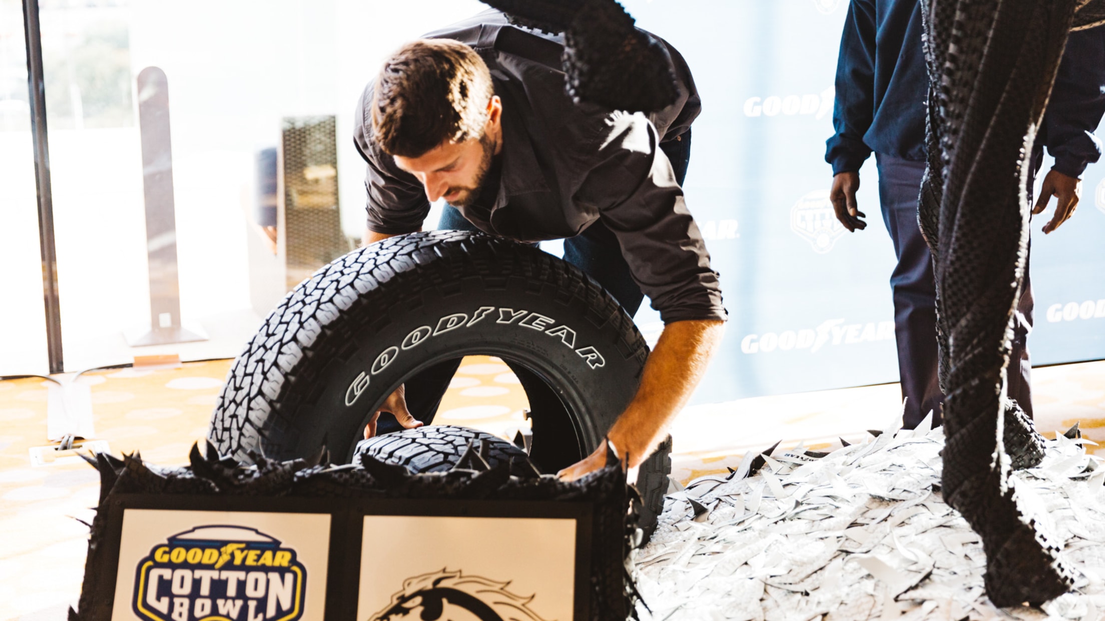 Using tires, Blue Jays righty crafts mascot sculptures for Cotton Bowl