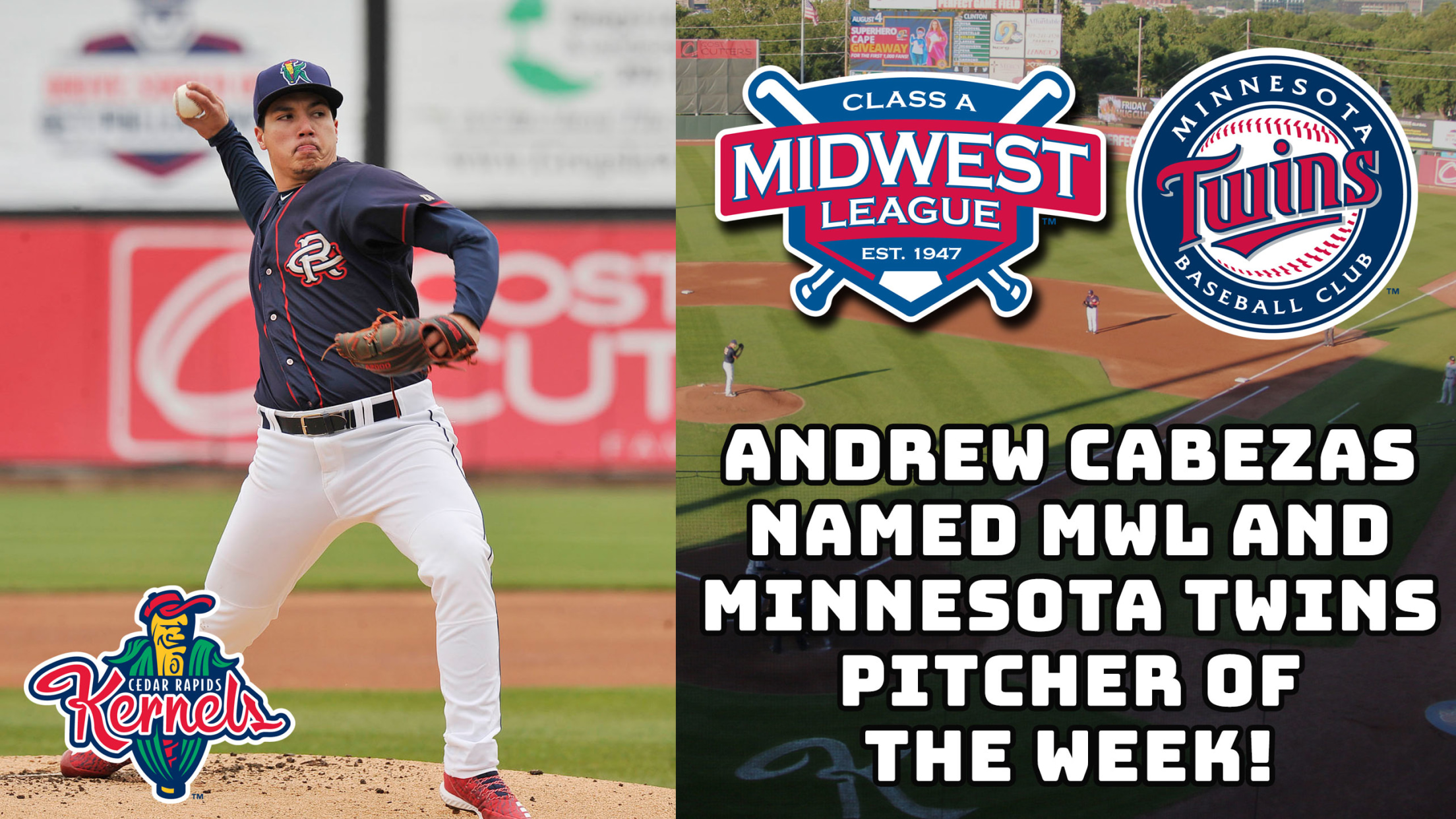 Cedar Rapids, IA - The Midwest League, MiLB.com and the Minnesota Twins announced today that Kernels pitcher Andrew Cabezas has been named the Midwest League and Minnesota Twins Pitcher of the Week for the period ending May 19th.On May 15th vs. Quad Cities, Cabezas allowed one hit and struck out