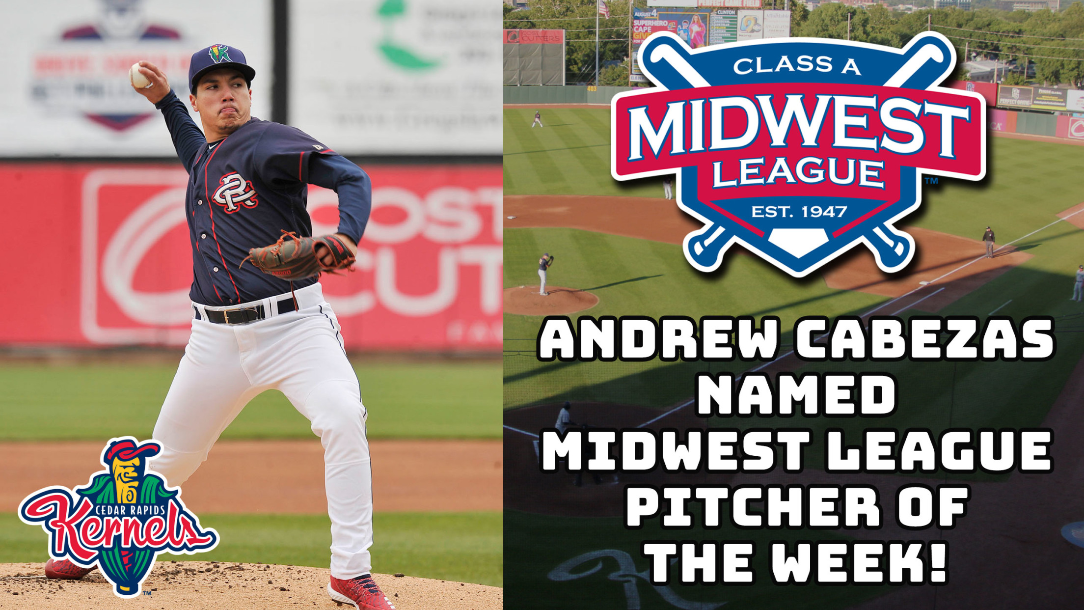 Cedar Rapids, IA - The Midwest League and MiLB.com announced today that Kernels pitcher Andrew Cabezas has been named the Midwest League Pitcher of the Week for the period ending July 7th.Cabezas threw a complete game, one hit shutout in a 3-0 Kernels win at Quad Cities on July 6th