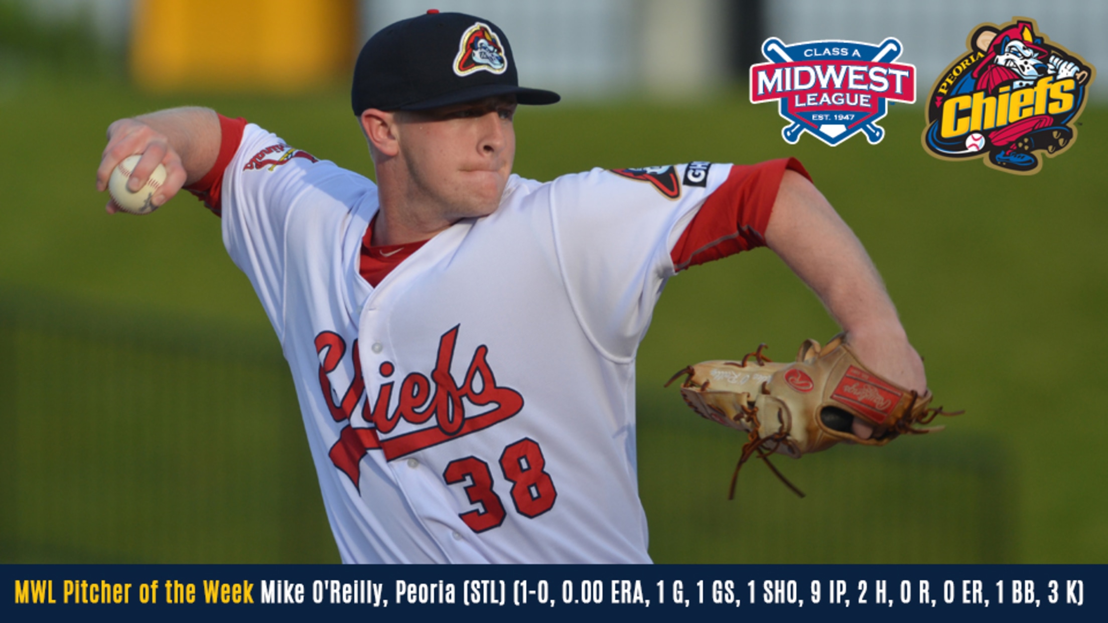 PEORIA, IL - The Midwest League announced Monday that Peoria Chiefs pitcher Mike O'Reilly was named Midwest League Pitcher of the Week for the week of June 5-11. This marks the first individual award for a Chiefs pitcher in the 2017 season.