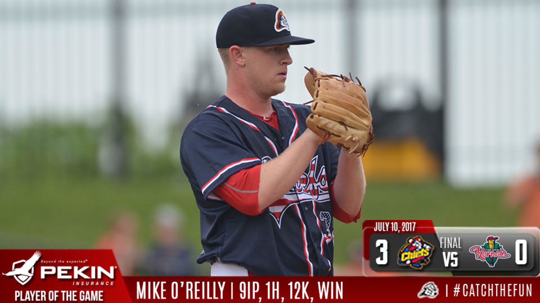 Cedar Rapids, IA - Mike O'Reilly retired the first 18 batters he faced and fired his second one-hitter of the season as the Peoria Chiefs beat the Cedar Rapids Kernels 3-0 Monday afternoon. The win moves the Chiefs to 11-8 in the second half and 41-47 overall. O'Reilly took a perfect