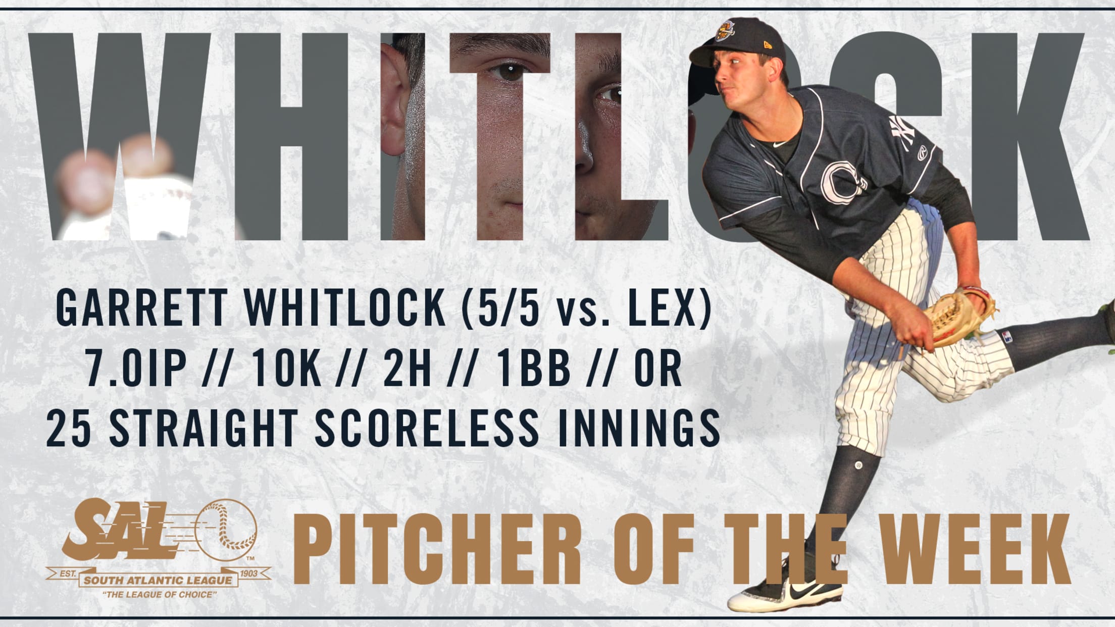 CHARLESTON, S.C. - After dominating with a career-best ten strikeouts and taking a perfect game into the fifth inning on Saturday, right-hander Garrett Whitlock has been named the South Atlantic League Pitcher of the Week by the league office on Monday.The Yankees' 18th round pick in last year's draft, Whitlock