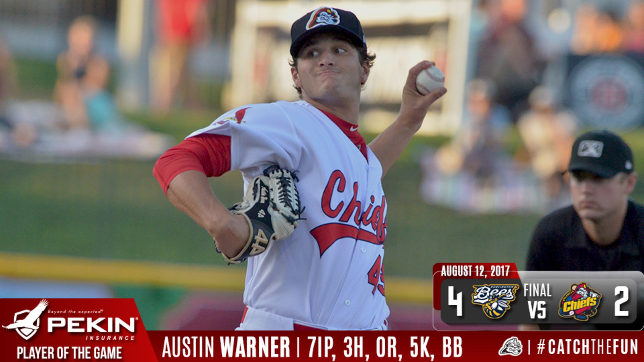 Clinton, IA - Left-hander Austin Warner struck out 11 batters over 7 2/3 innings as the Peoria Chiefs beat the Clinton LumberKings Monday night to regain the Western Division Wild Card lead. The win moves the Chiefs to 25-19 in the second half, a half-game ahead of Beloit who lost