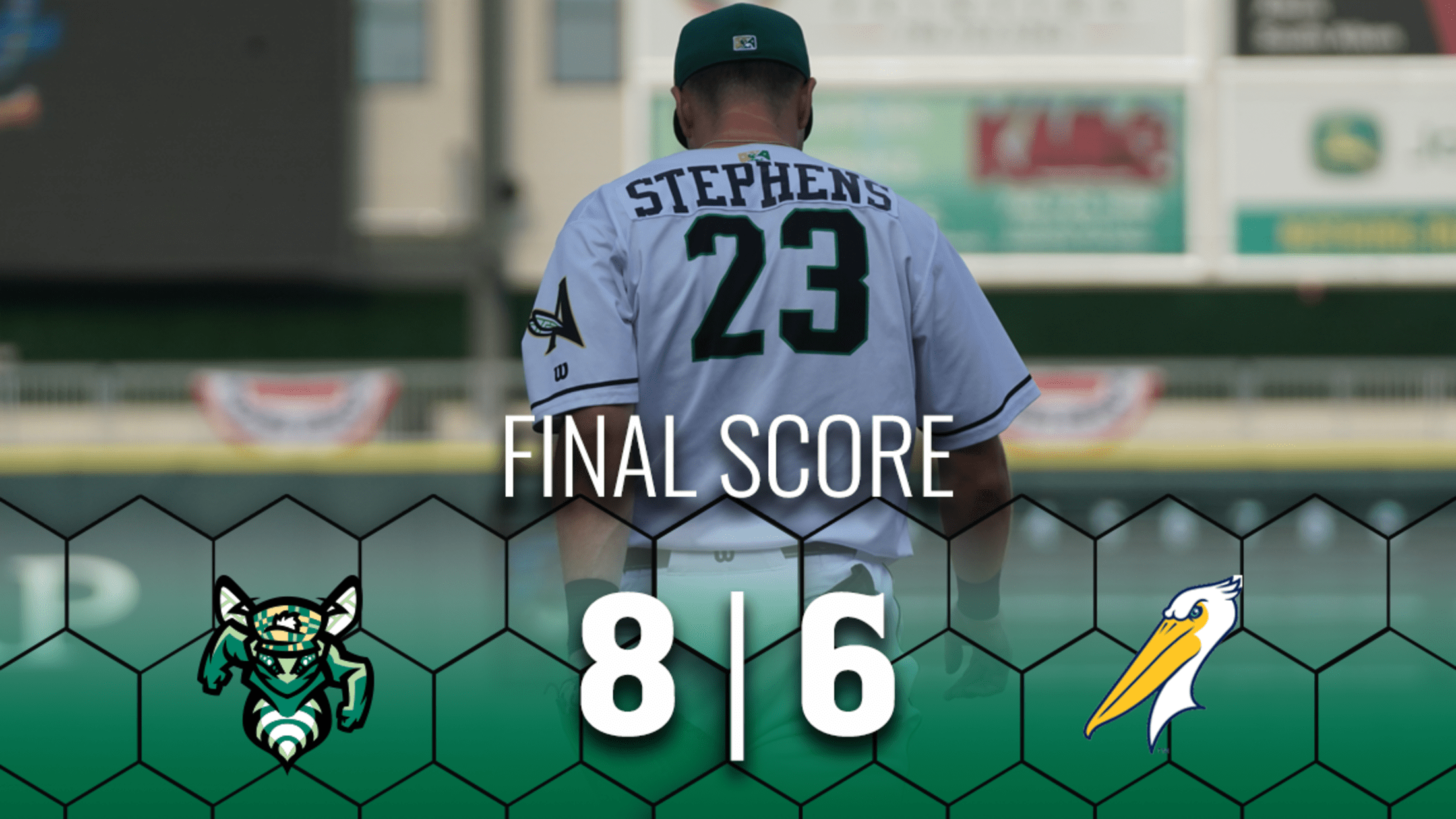 North Augusta -- Landon Stephens hit two home runs, and his second broke the tie in the 8th inning. The Jackets hung on for an 8-6 victory and split the six-game series with the Myrtle Beach Pelicans (Chicago Cubs). Manuel Espinoza retired the first nine he faced for Myrtle Beach