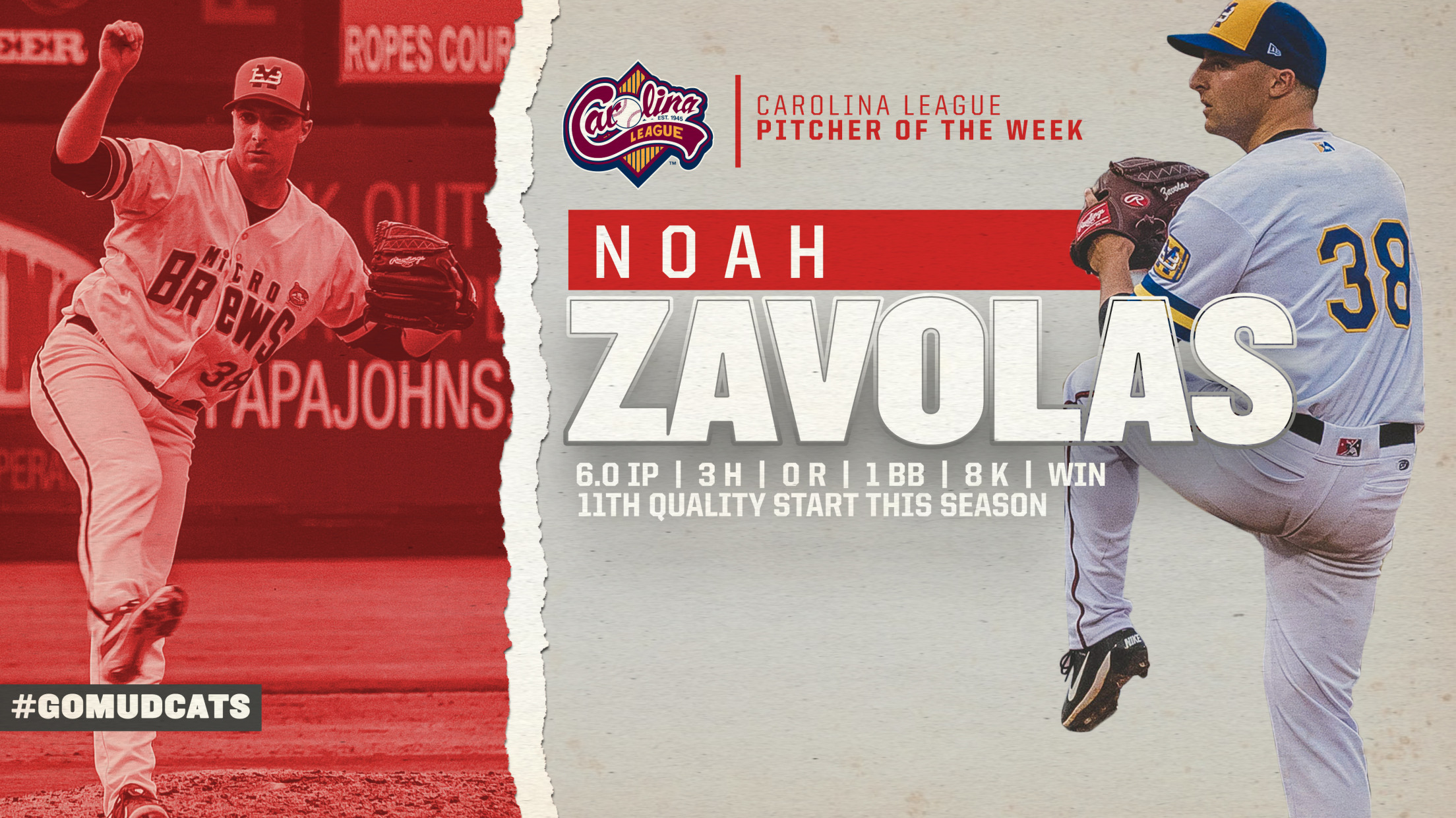ZEBULON, N.C. - The Carolina Mudcats, the Class-A Advanced affiliate of the Milwaukee Brewers, are thrilled to announce today that starting pitcher Noah Zavolas has been named the Carolina League's Pitcher of the Week for the week ending on August 4. Zavolas, who was also a mid-season Carolina League All-Star,