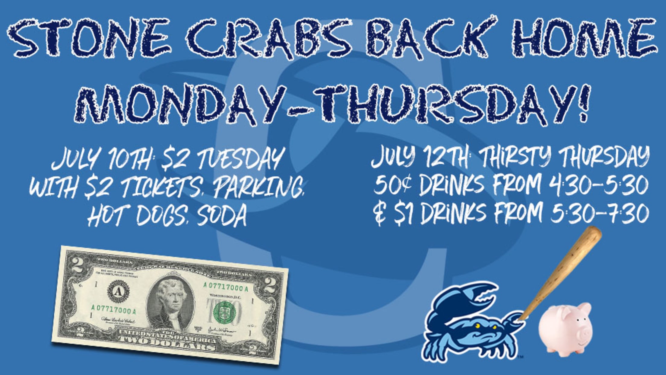 The Stone Crabs are back home starting Monday, July 9th for a four-game homestand against the St. Lucie Mets. Daily Specials and an All-You-Can-Eat Picnic will give you plenty of reasons to come cheer on your Stone Crabs!