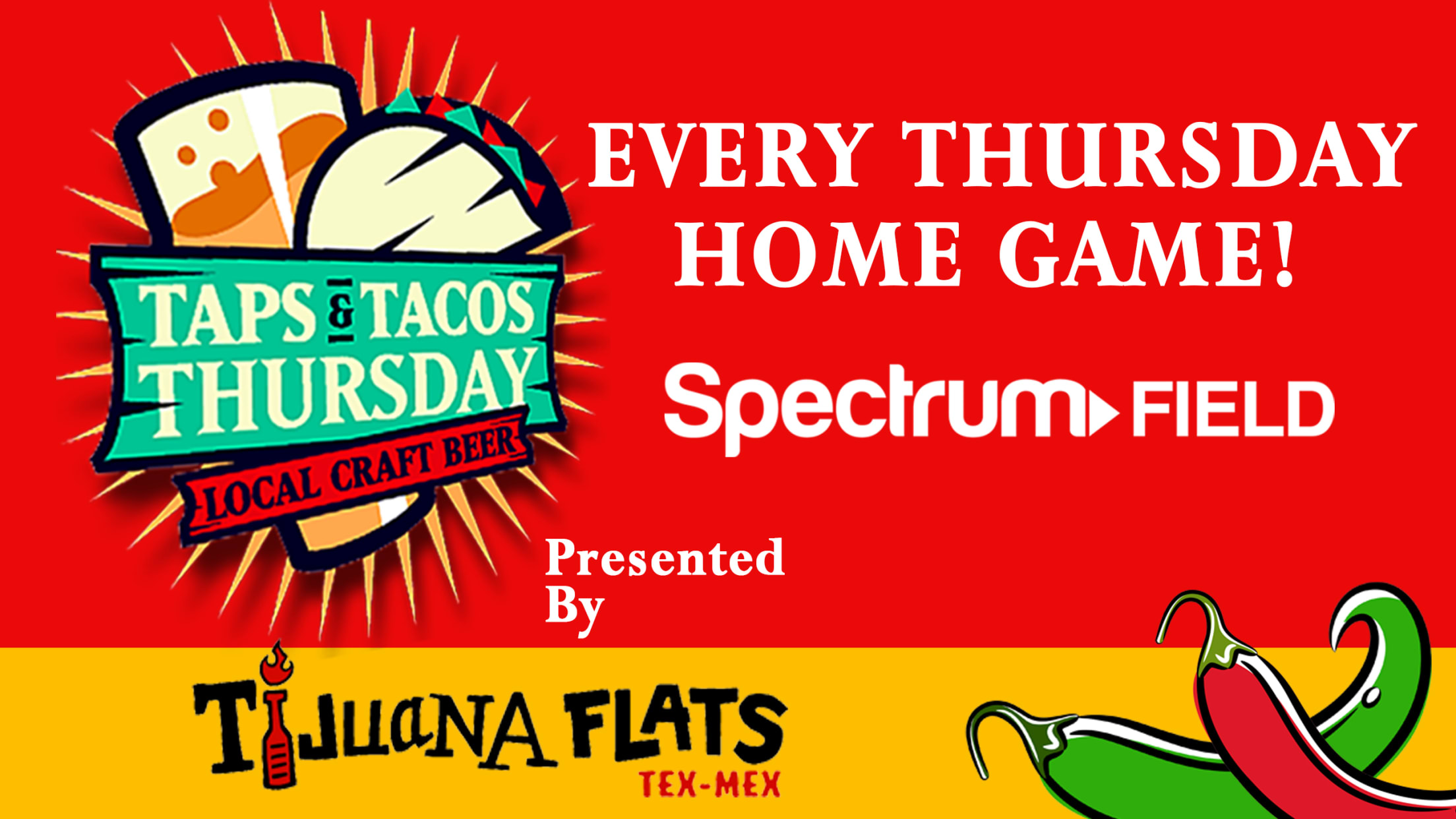 TICKETSTaps & Tacos by Tijuana Flats Thursday returns on June 20th to Spectrum Field with 6 p.m. gates for the 7 p.m. game vs the Daytona Tortugas. Enjoy $3.50 24oz craft drafts in the beer garden with giant Connect-4 and Jenga. Don't miss the nachos and tacos from the T-Flats food