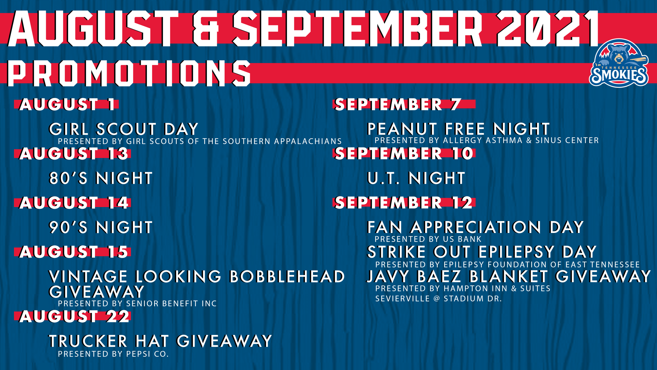Other giveaways in August and September include a vintage looking bobblehead (August 15) presented by Senior Benefit Inc. and a Smokies trucker hat (August 22) presented by Pepsi. All giveaways are distributed to the first 1,000 fans who enter the gates unless otherwise stated.