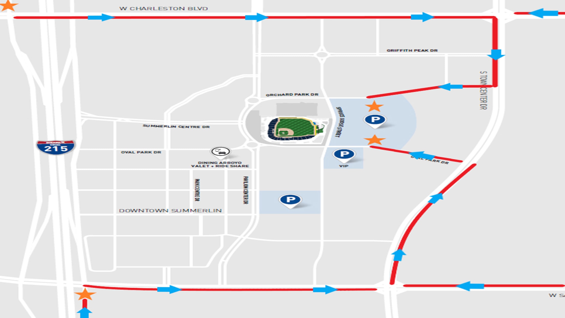 Traffic control personnel will be in place to assist with crossing Pavilion Center Drive before, during and after Las Vegas Ballpark events.