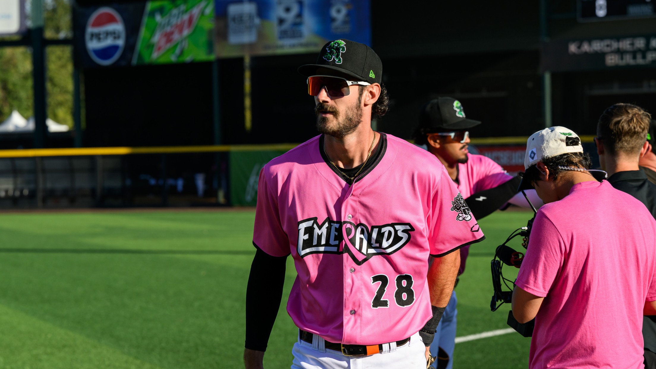 Let’s talk about the look. Bryce Eldridge turns away, visibly distraught. Not because he's embarrassed by the facial hair choice in question – in August, he showed up at PK Park, fresh off the all-star break, less like the Emeralds’ prodigal 6’7 son and more like a typical college kid.