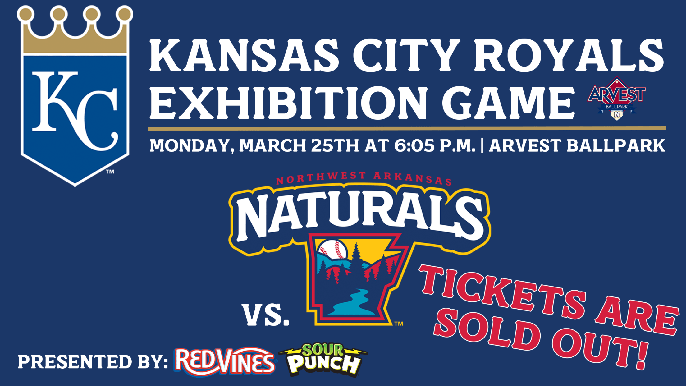SPRINGDALE, Ark. – The Northwest Arkansas Naturals exhibition game against the Kansas City Royals at Arvest Ballpark on Monday, March 25th is sold out. Tickets are no longer available online or at the Arvest Ballpark Box Office for the special event, which is presented by Red Vines and Sour Punch.