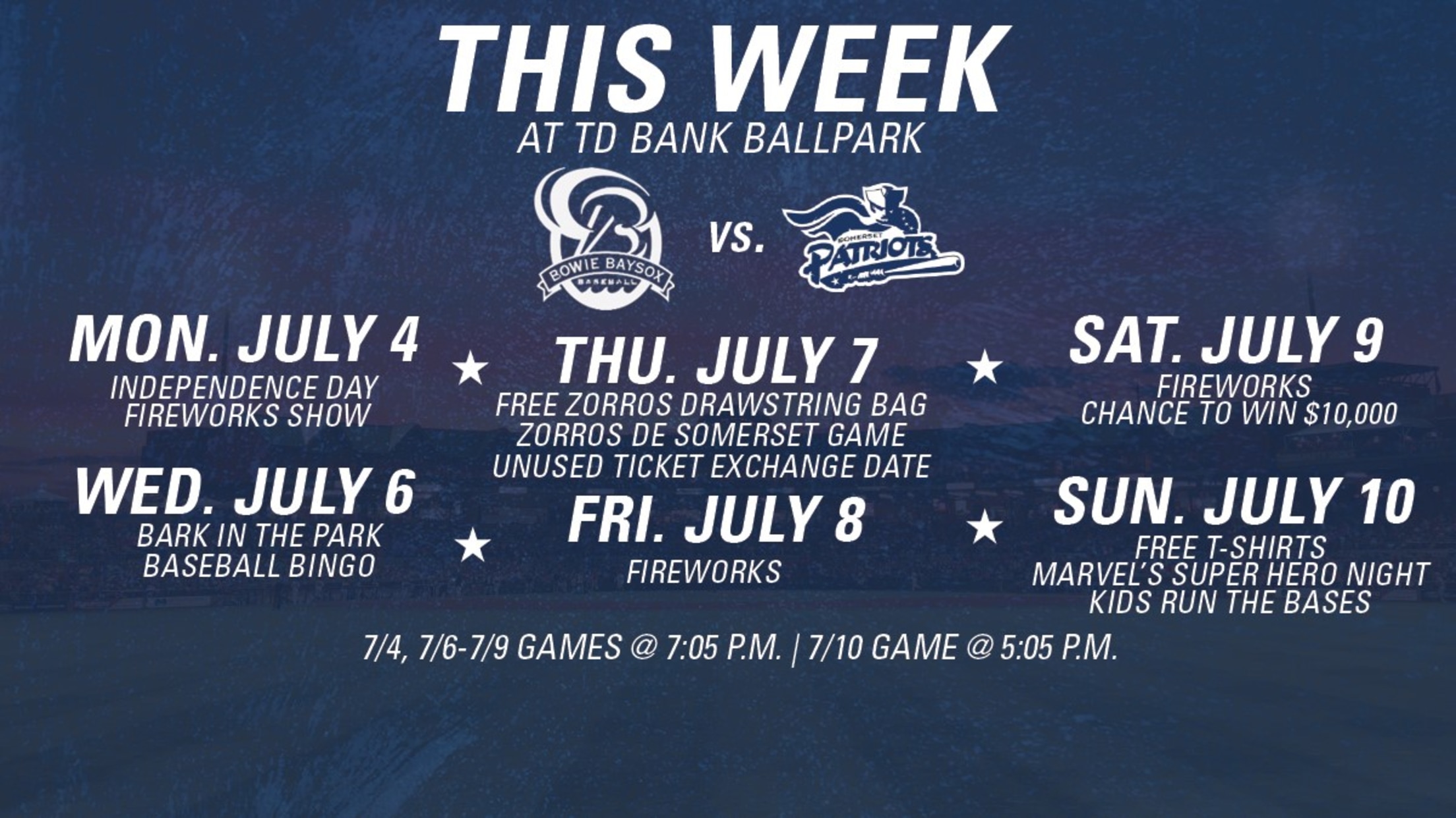 Bridgewater, New Jersey – The Somerset Patriots, the New York Yankees Double-A affiliate, have several promotions and giveaways scheduled for the upcoming homestand against the Bowie Baysox (Baltimore Orioles), beginning on Monday, July 4 at TD Bank Ballpark.