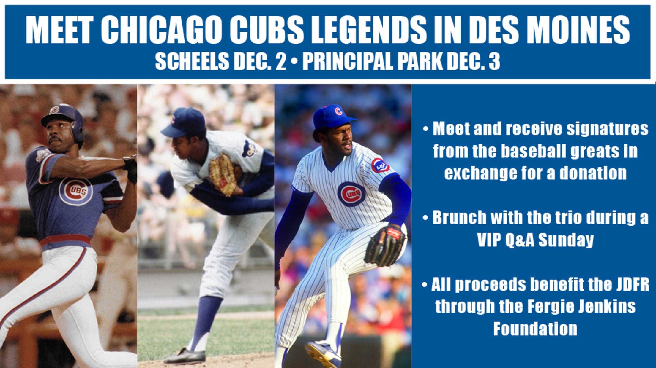 Meet three baseball legends, Fergie Jenkins, Andre Dawson and Lee Smith, in Des Moines! The trio will be meeting fans Dec. 2-3 to raise money for the JDFR Diabetes Foundation through the Fergie Jenkins Foundation. Get autographs at SCHEELS on Saturday, Dec. 2 and at Principal Park on Sunday, Dec. 3, or get up-close and personal with a VIP Q&A with the All-Stars at the Cub Club Sunday. Event details are listed below.