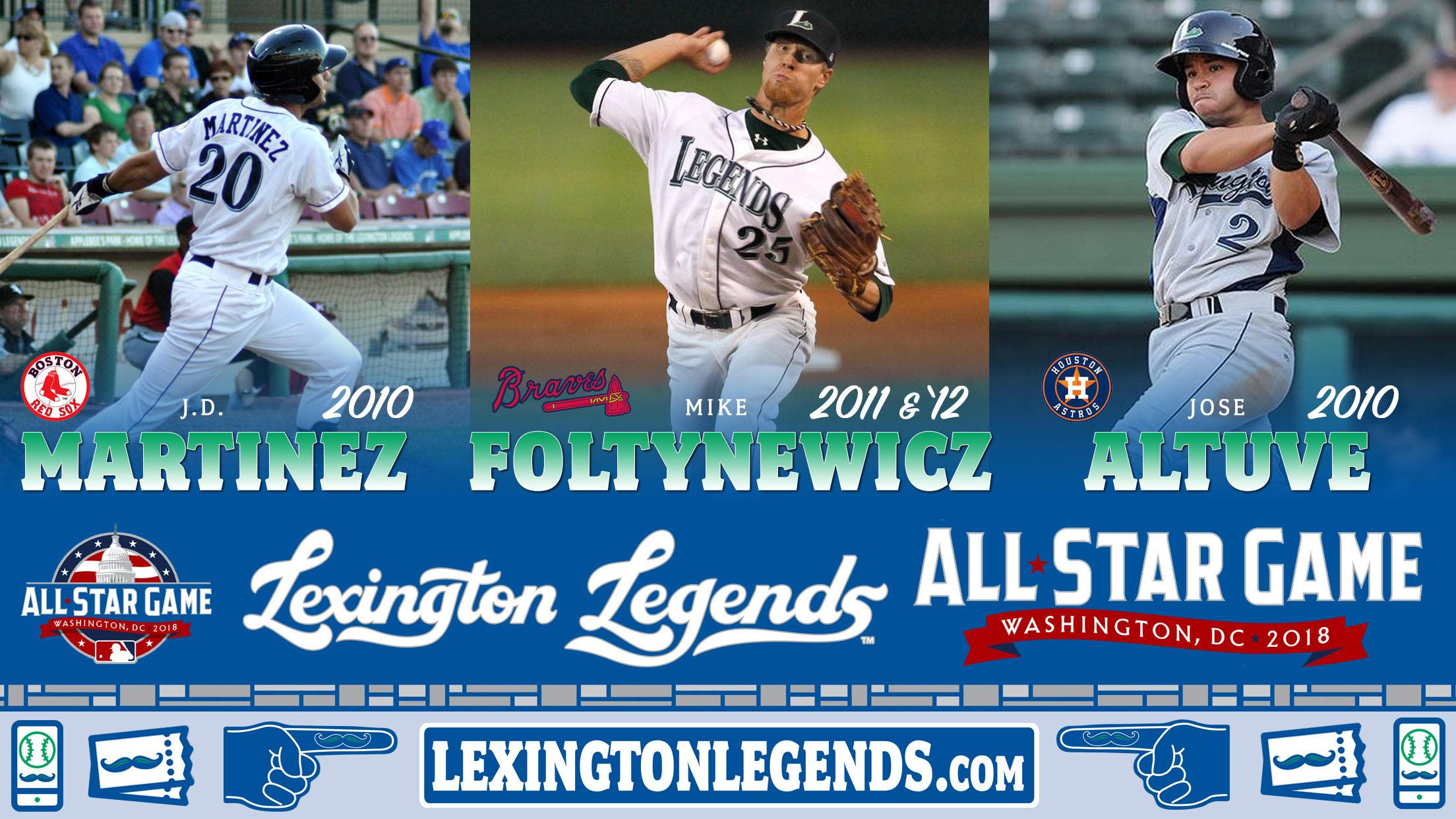 WHITAKER BANK BALLPARK (Lexington, KY) - Three former Lexington Legends have been chosen as MLB All-Stars to be showcased during the All-Star Game at Nationals Park in Washington, D.C. José Altuve (2010), J.D. Martinez (2010) and Mark Foltynewicz (2011 and 2012) have been named to the prestigious game. "We are