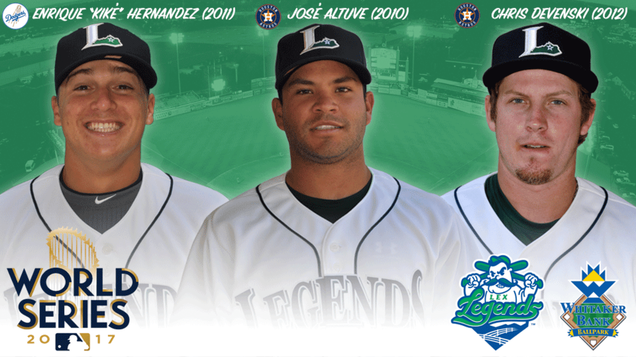 WHITAKER BANK BALLPARK (Lexington, KY) - Three former Lexington Legends will be competing in the 2017 World Series when it starts tonight in Los Angeles. José Altuve (2010) and Chris Devenski (2012) are on the roster for the Houston Astros, and they will be taking on Enrique "Kiké" Hernandez (2011) and