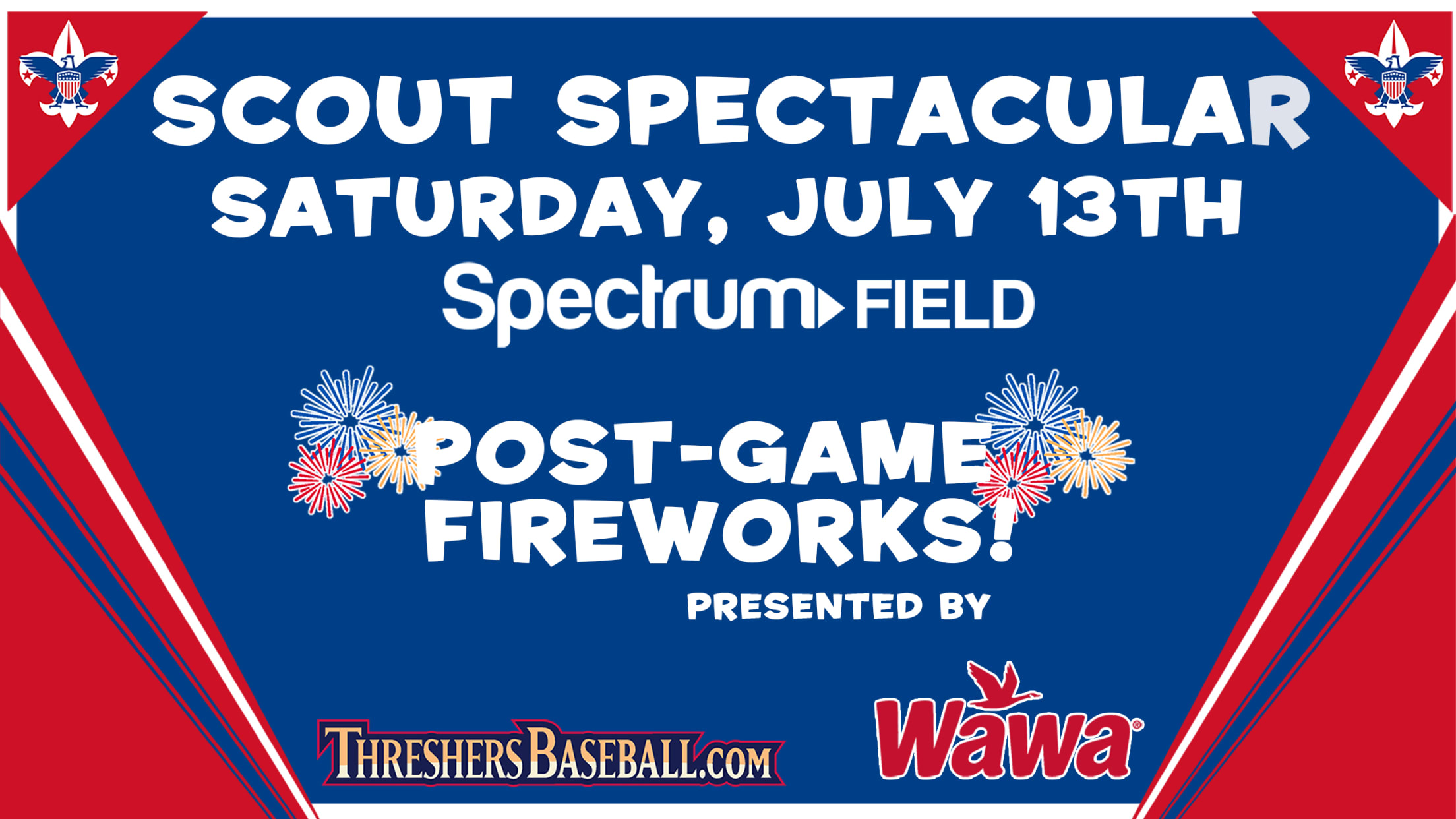 Join the Threshers for the 2019 Scout Spectacular at Spectrum Field on Saturday, July 13th. Saturday's games are part of a double-header, with two 7-inning games starting at 5 p.m. Gates will open at 4:30 p.m. The doubleheader is as a result of Friday night's game being postponed due to