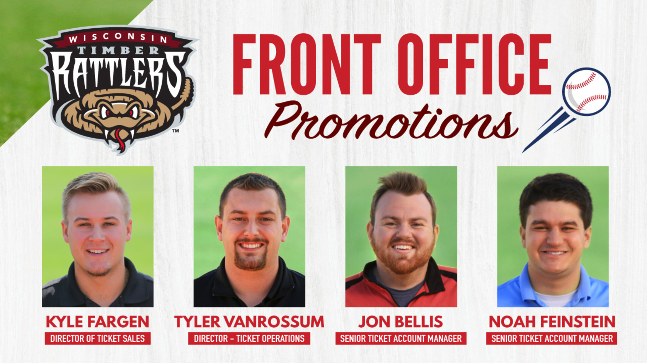 GRAND CHUTE, WI – All four members of the Wisconsin Timber Rattlers ticket staff – Kyle Fargen, Tyler VanRossum, Jon Bellis, and Noah Feinstein – are receiving promotions and new titles in recognition of surpassing season ticket and group sales goals for the Midwest League affiliate of the Milwaukee Brewers