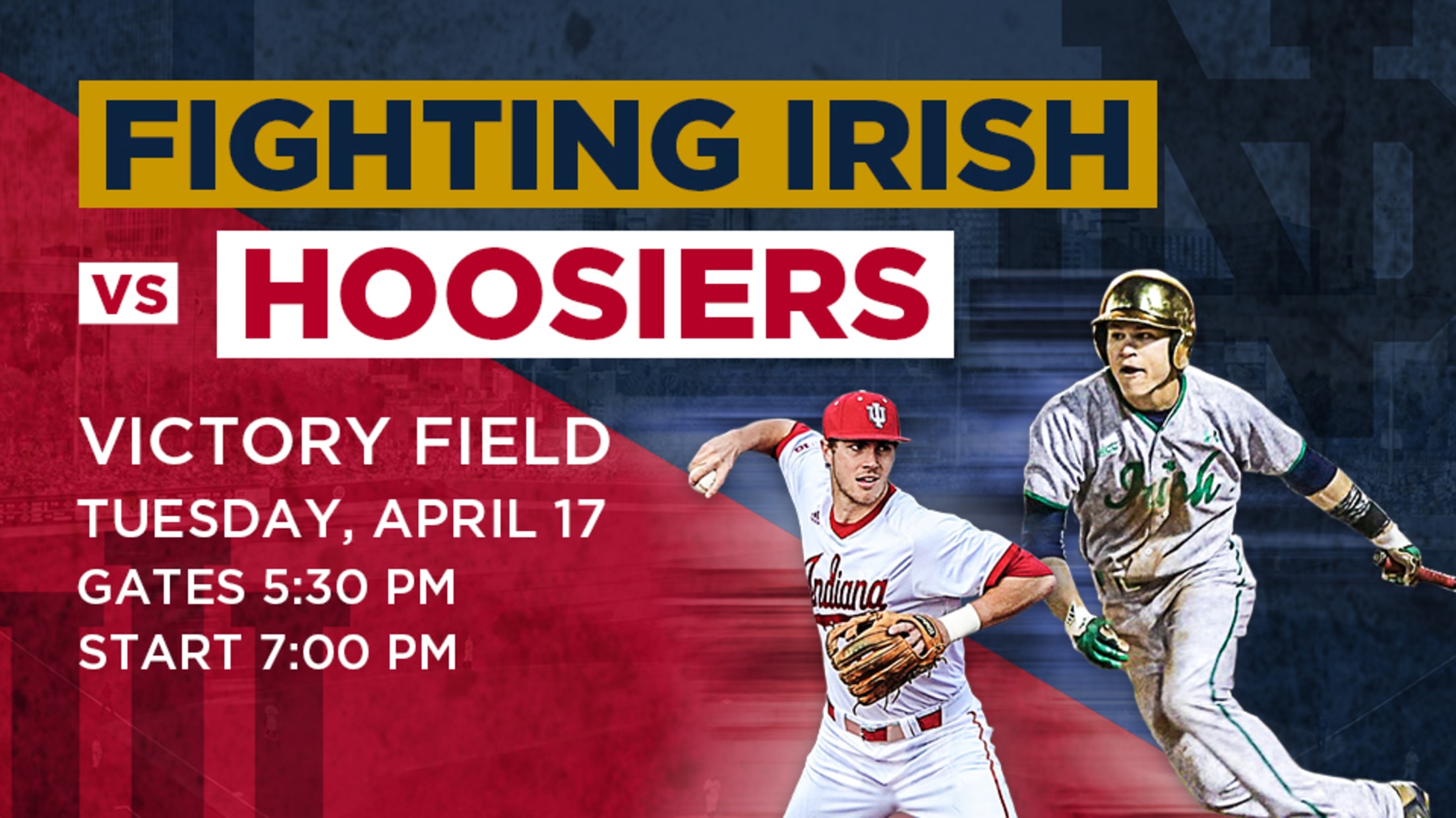 INDIANAPOLIS - On Tuesday, April 17, two of Indiana's best college baseball programs take the field in downtown Indianapolis as Indiana University hosts the University of Notre Dame at Victory Field. First pitch is scheduled for 7 p.m., with gates opening at 5:30 p.m. Tickets are on sale today.