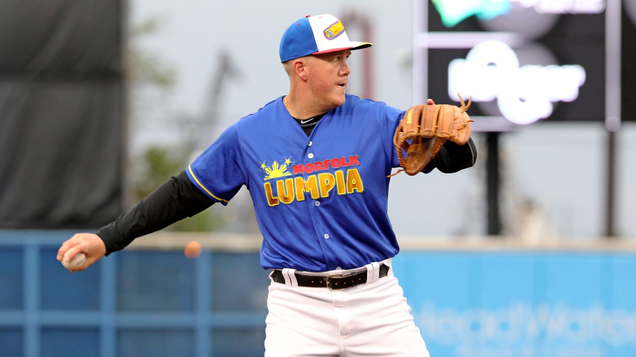A specialty NewEra cap has been created for the night. The blue cap with a brim inspired by the Flag of the Philippines features lumpia logo on the front of the cap and the Flag of the Philippines stars and sun on the brim. The customized jersey features the Norfolk Lumpia word mark, as well as the lumpia logo on the left sleeve.