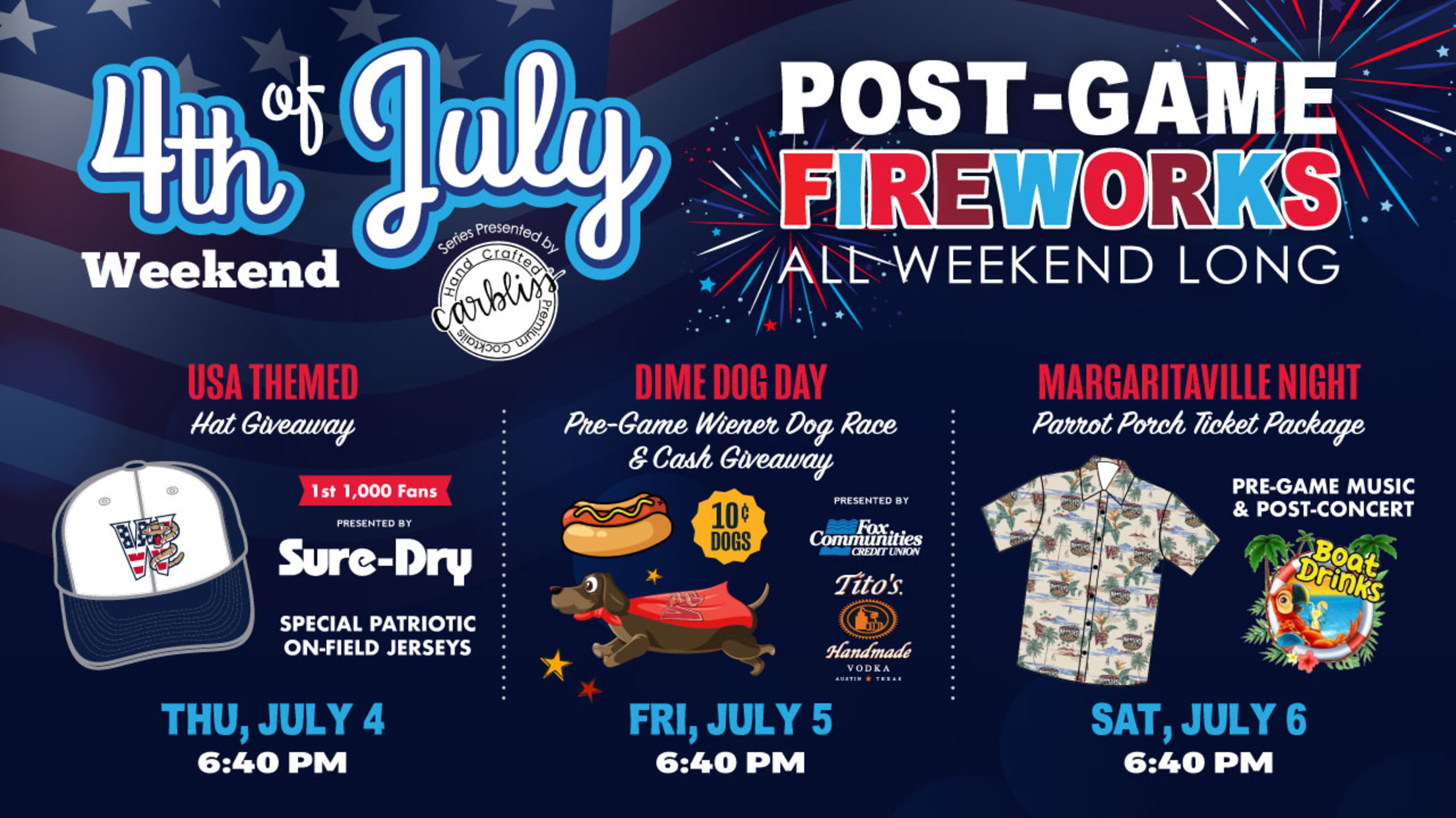 GRAND CHUTE, WI – Celebrate Independence Day with the Wisconsin Timber Rattlers at Neuroscience Group Field. In fact, you can celebrate the whole weekend in this short three-game homestand presented by Carbliss as the Beloit Sky Carp visit from July 4 through July 6. Fireworks are planned after every game with patriotic jerseys on the Fourth, Wiener Dog Races on the fifth, and a trip to Margaritaville on the sixth.