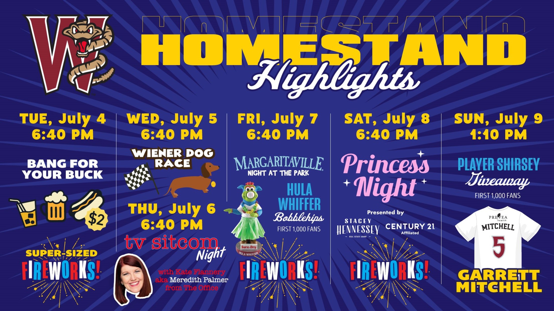 GRAND CHUTE, WI – The Wisconsin Timber Rattlers begin their next homestand against the Beloit Sky Carp on the Fourth of July! The in-state rivals have a six-game series so pace yourself when you come out to celebrate Independence, Hotdogs & Wiener Dogs, The Office, Margaritaville, and more from July 4 through July 9.