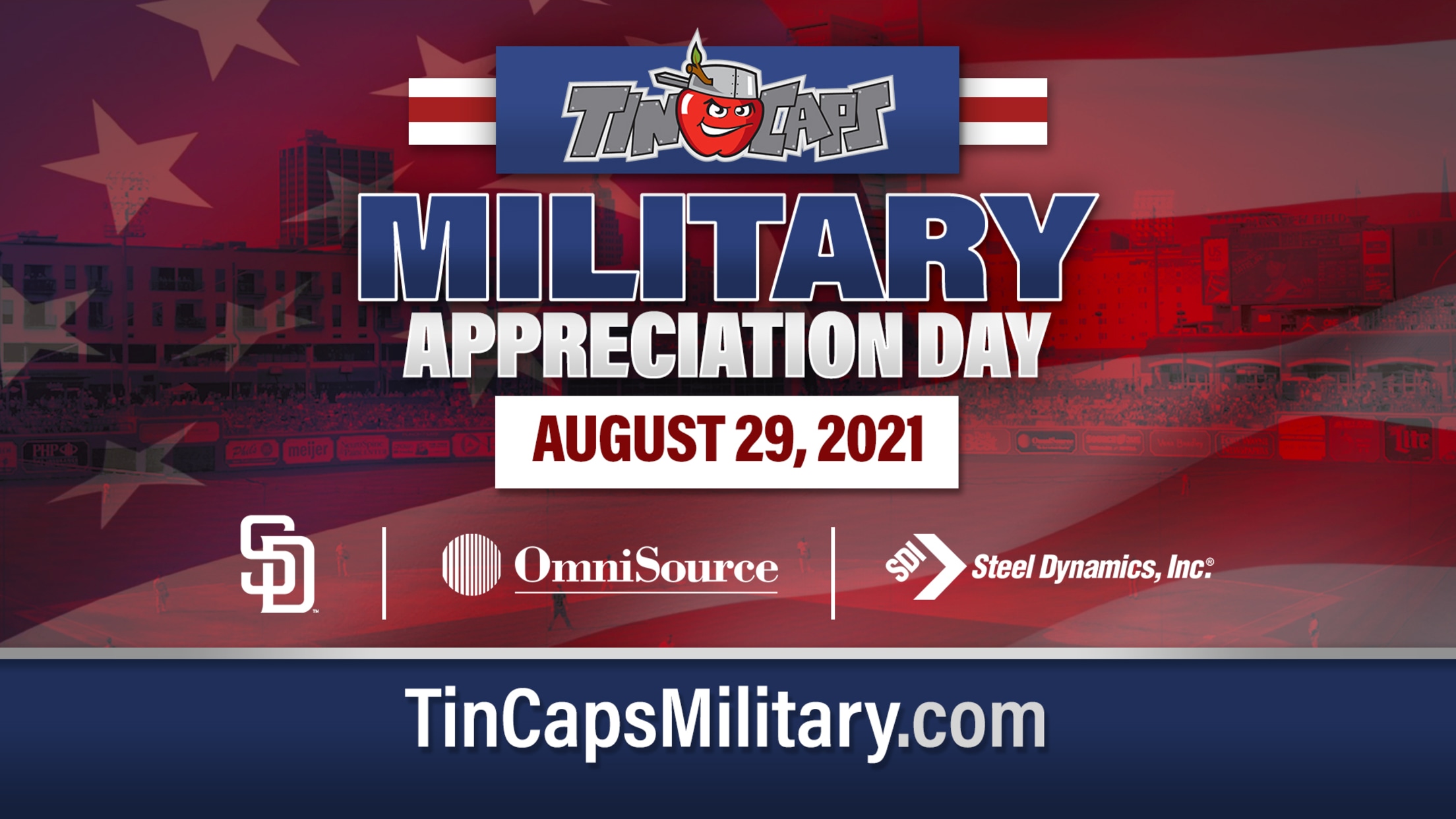 FORT WAYNE, Ind. — The Fort Wayne TinCaps are partnering again with OmniSource LLC, Steel Dynamics Inc., and the San Diego Padres to welcome military personnel to Parkview Field for Military Appreciation Day on Sunday, Aug. 29 (1:05 p.m.) when the team hosts the Dayton Dragons (Cincinnati Reds affiliate).