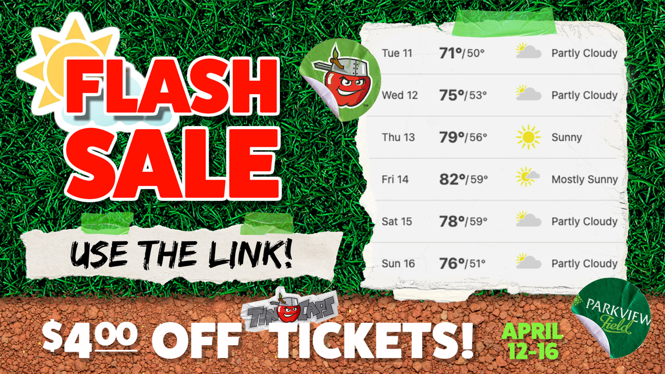 FORT WAYNE, Ind. – As Opening Day at Parkview Field quickly approaches, the TinCaps are excited to announce a flash sale on tickets. With sun and warm temperatures in the forecast, fans can receive a $4 discount on All-Star and Reserved seats for home games between April 12-16, when the