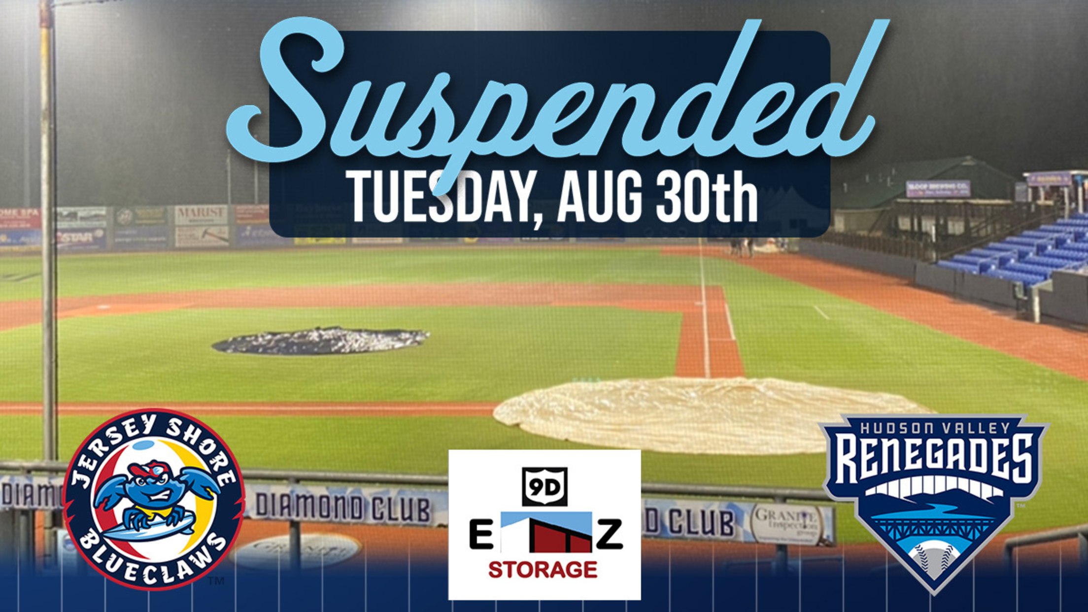 WAPPINGERS FALLS, N.Y. (August 30, 2022) — The Hudson Valley Renegades and Jersey Shore BlueClaws series opener was suspended due to rain with Jersey Shore leading 7-4 entering the bottom of the fifth inning on Tuesday night at Dutchess Stadium. The game will be resumed and played to its full