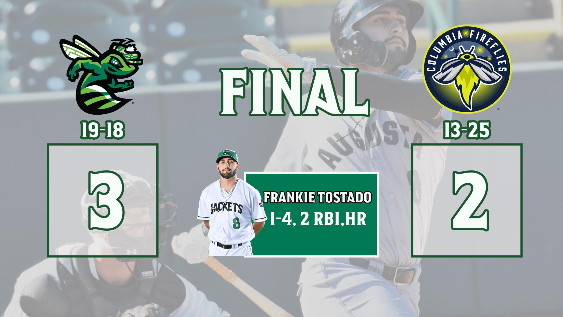 Tostado's home run in the 4th inning was a big one. His 6th of the year helped the GreenJackets take the lead as Tostado hit it out to right field.