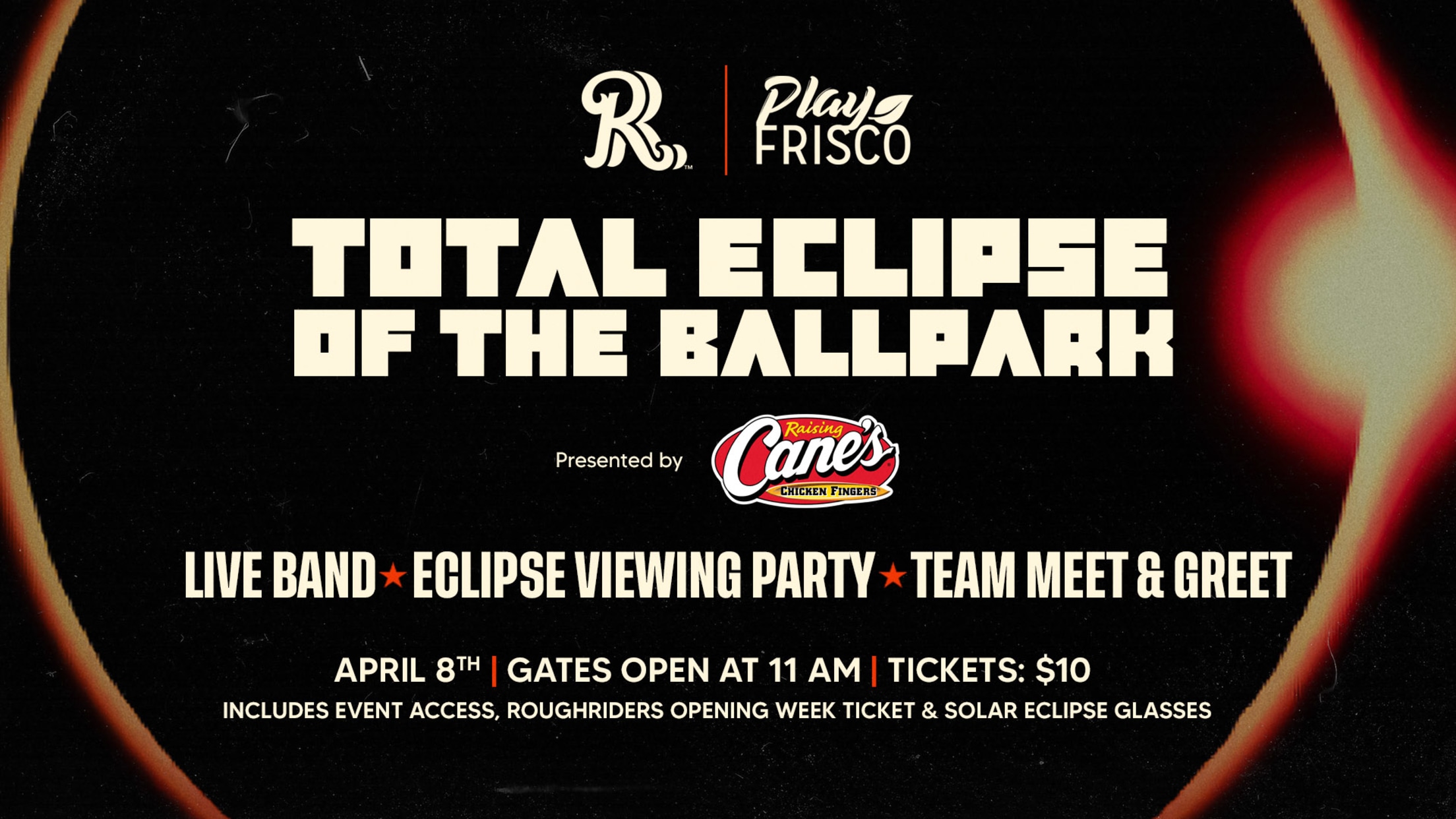 FRISCO, Texas (February 26, 2024) – The Frisco RoughRiders, Double-A affiliate of the World Series champion Texas Rangers, and Play Frisco will host Total Eclipse of the Ballpark presented by Raising Cane's for the solar eclipse at Riders Field on April 8th. The day before the RoughRiders host their 2024