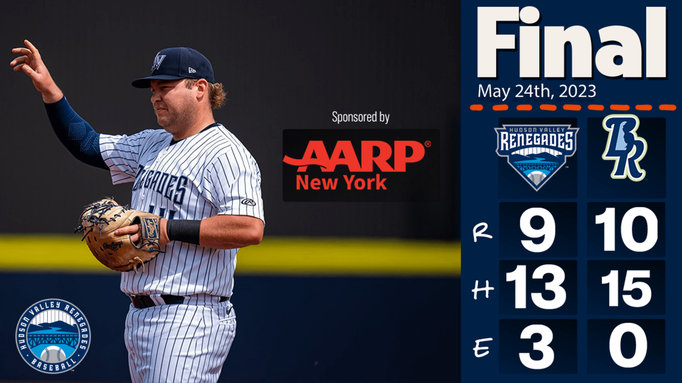 Wilmington, Del. (May 24, 2023) — The Hudson Valley Renegades fell 10-9 in extra innings to the Wilmington Blue Rocks on Wednesday at Frawley Stadium.