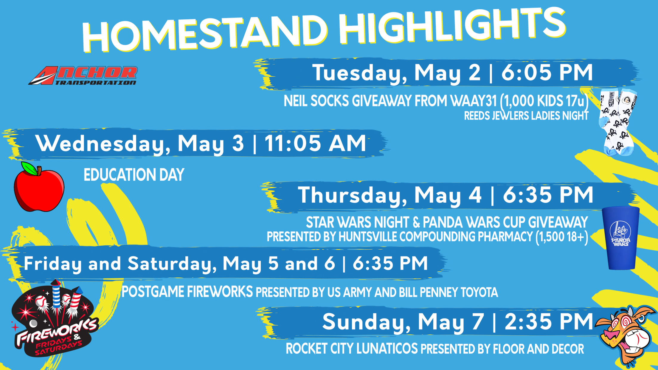 The Rocket City Trash Pandas are back at home to begin the month of May with a thrilling six-game homestand featuring a couple giveaways, the second Education Day game of the season, Star Wars night, a pair of weekend fireworks spectaculars, and wrapping up with the debut of the Lunaticos
