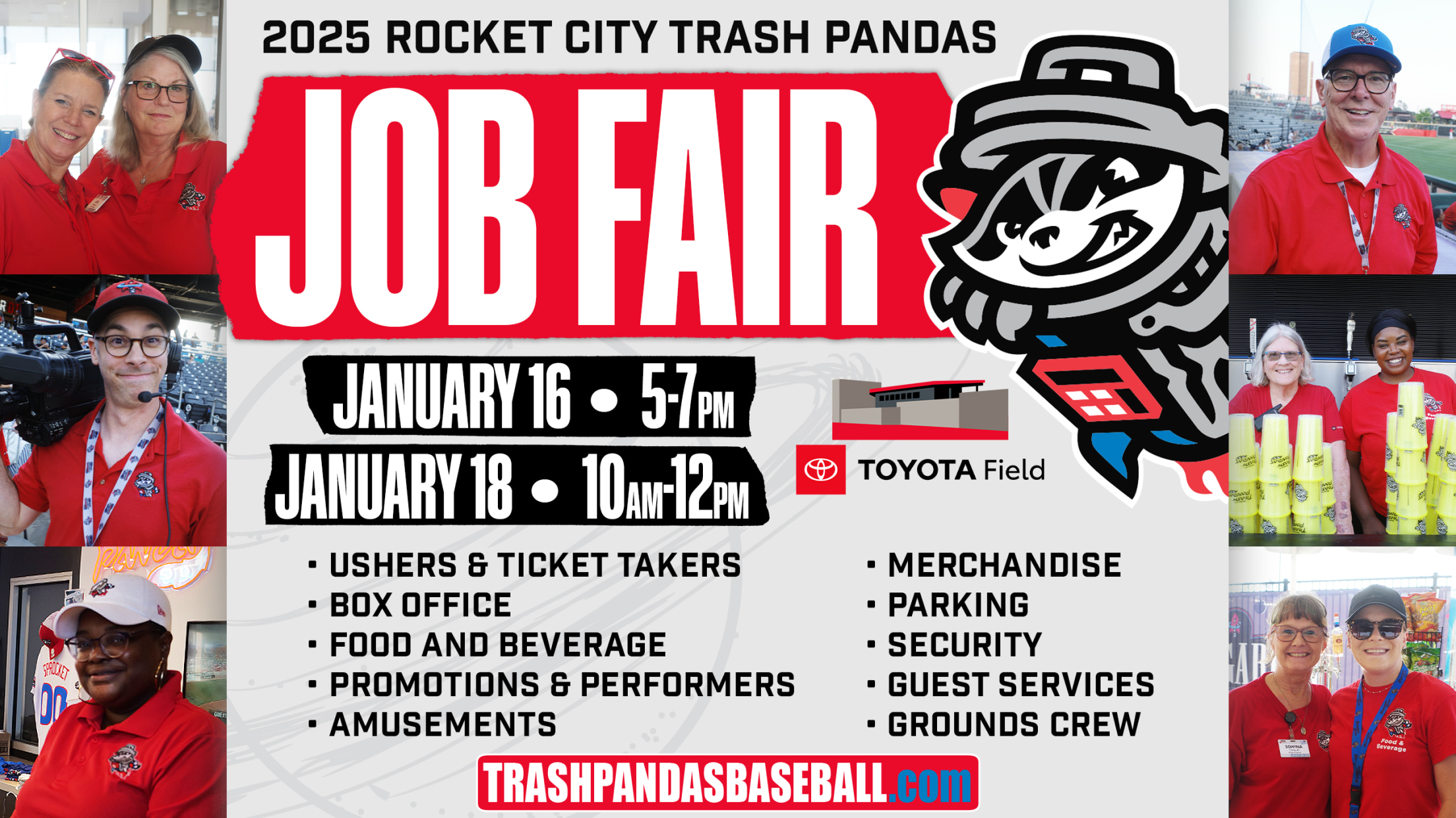 MADISON, Alabama – The Rocket City Trash Pandas are hiring! Ahead of the fifth season of baseball in 2025, the team will be hosting a gameday job fair on two separate dates at Toyota Field: Thursday, January 16, from 5-7 pm and Saturday, January 18, from 10 am to 12