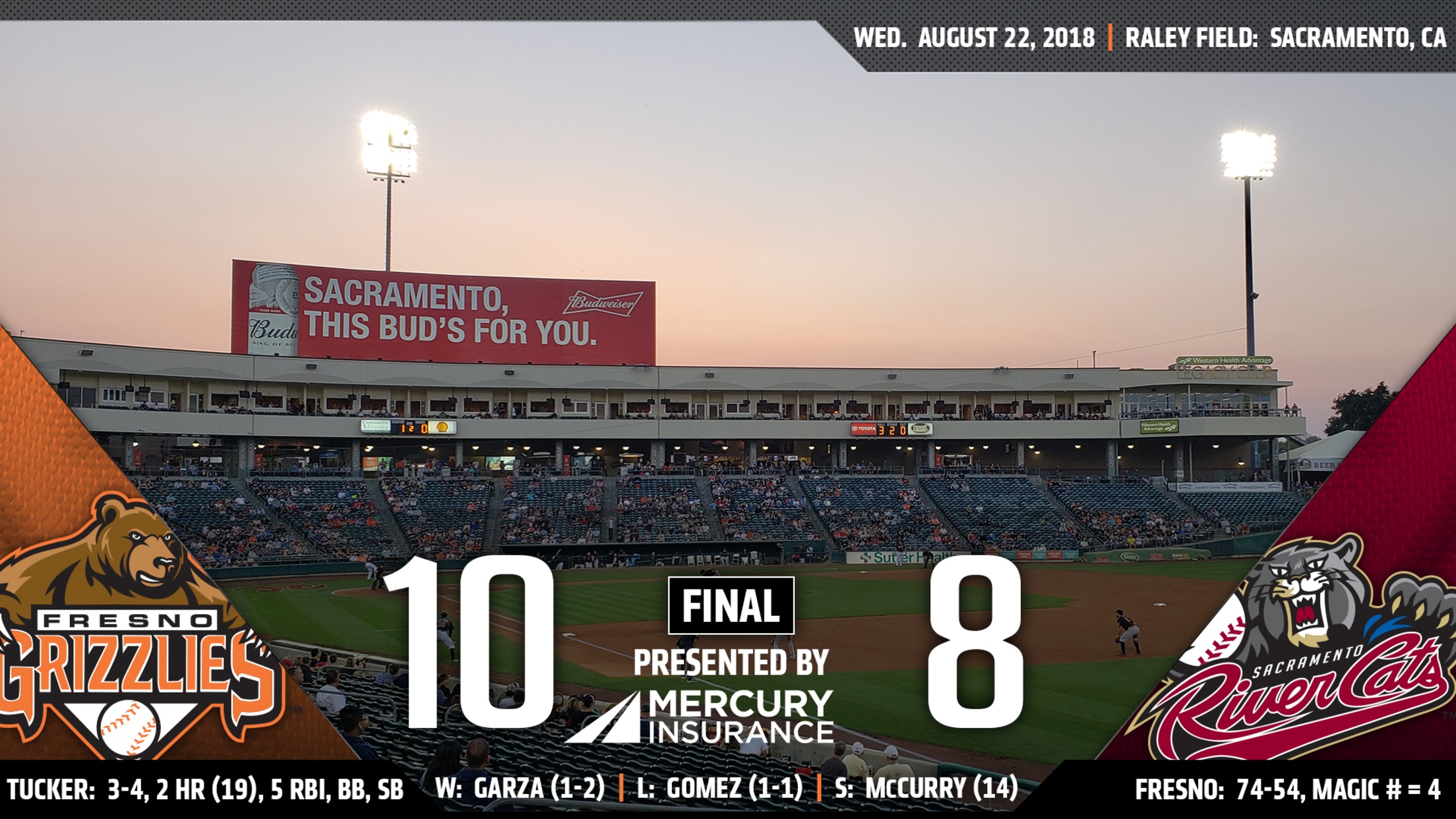 The Fresno Grizzlies (74-54) stunned the Sacramento River Cats (50-78) on Wednesday night at Raley Field with a six-run top of the ninth; their eighth victory this season when trailing after the sixth inning, and the sixth win of 2018 when trailing during the seventh, eighth or ninth. The 10-8 win coupled with Reno's 11-1 loss at Tacoma lowered Fresno's magic number to clinch the Pacific Northern Division to four. The earliest the Grizzlies can clinch is Friday, August 24 at home when they open a series against Salt Lake, as their lead over Reno jumped to eight games with 12 to play.