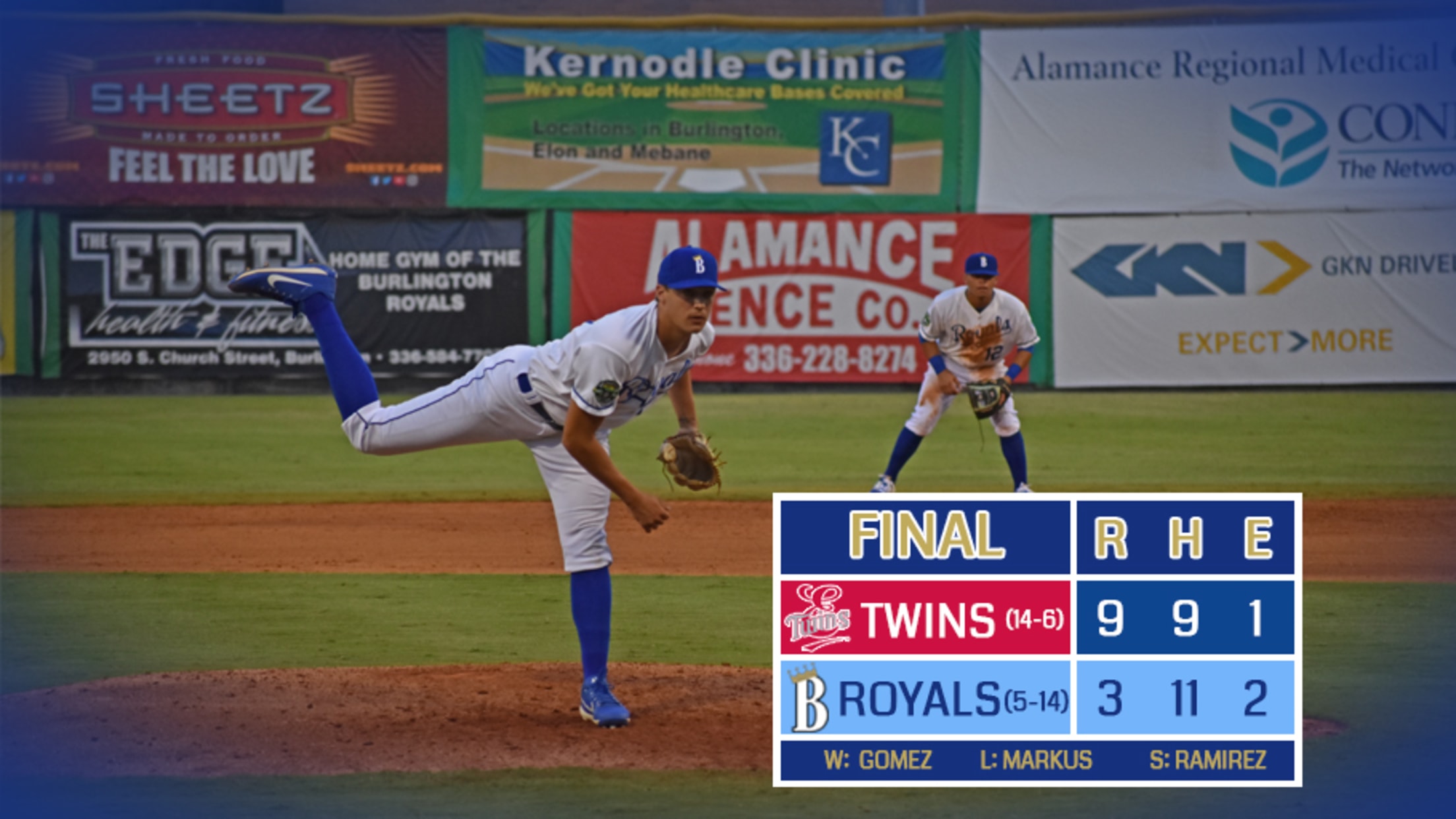 Burlington could not muster offense against Twins RHP Rickey Ramirez, who retired the Royals over the last 3.2 innings.