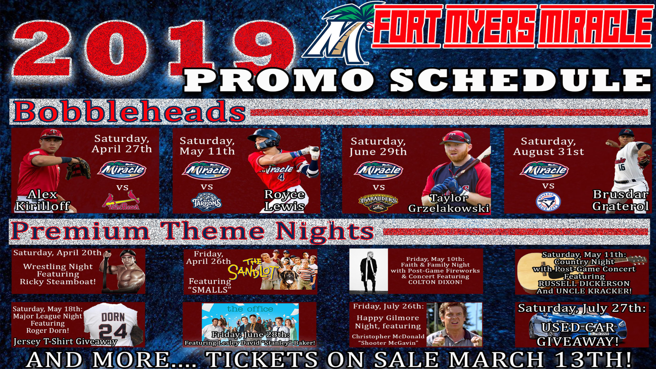 FORT MYERS, Fla. - The Florida State League Champion Fort Myers Miracle are excited to announce their 2019 Promotional Schedule, highlighted by back-to-back concerts on May 10 and 11 at Hammond Stadium.