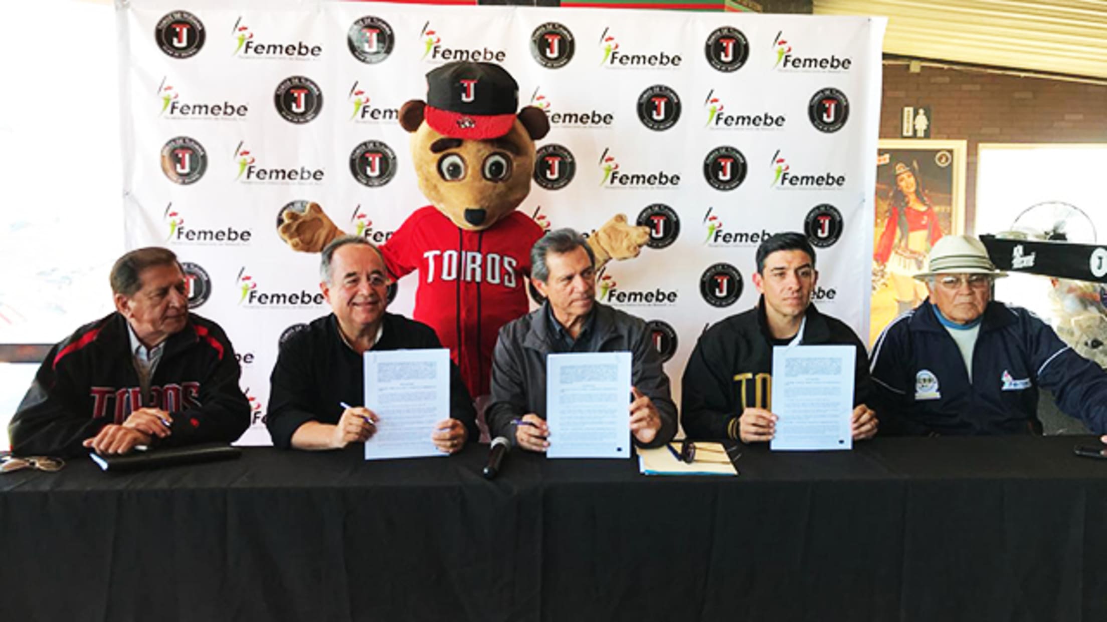 El importante documento fue firmado en una rueda de prensa que se desarrolló en el Torobar del estadio Gasmart que fue encabezada por Antonio Cano, director general de Toros de Tijuana y Freddy Armando Lugo Valenzuela, presidente de la AEBBC, quienes estuvieron acompañados por Ramón Sánchez, presidente de la Liga Municipal de Tijuana, Guillermo Armenta, director de desarrollo de Toros de Tijuana y Raúl Cano, asesor de la presidencia de Toros de Tijuana.