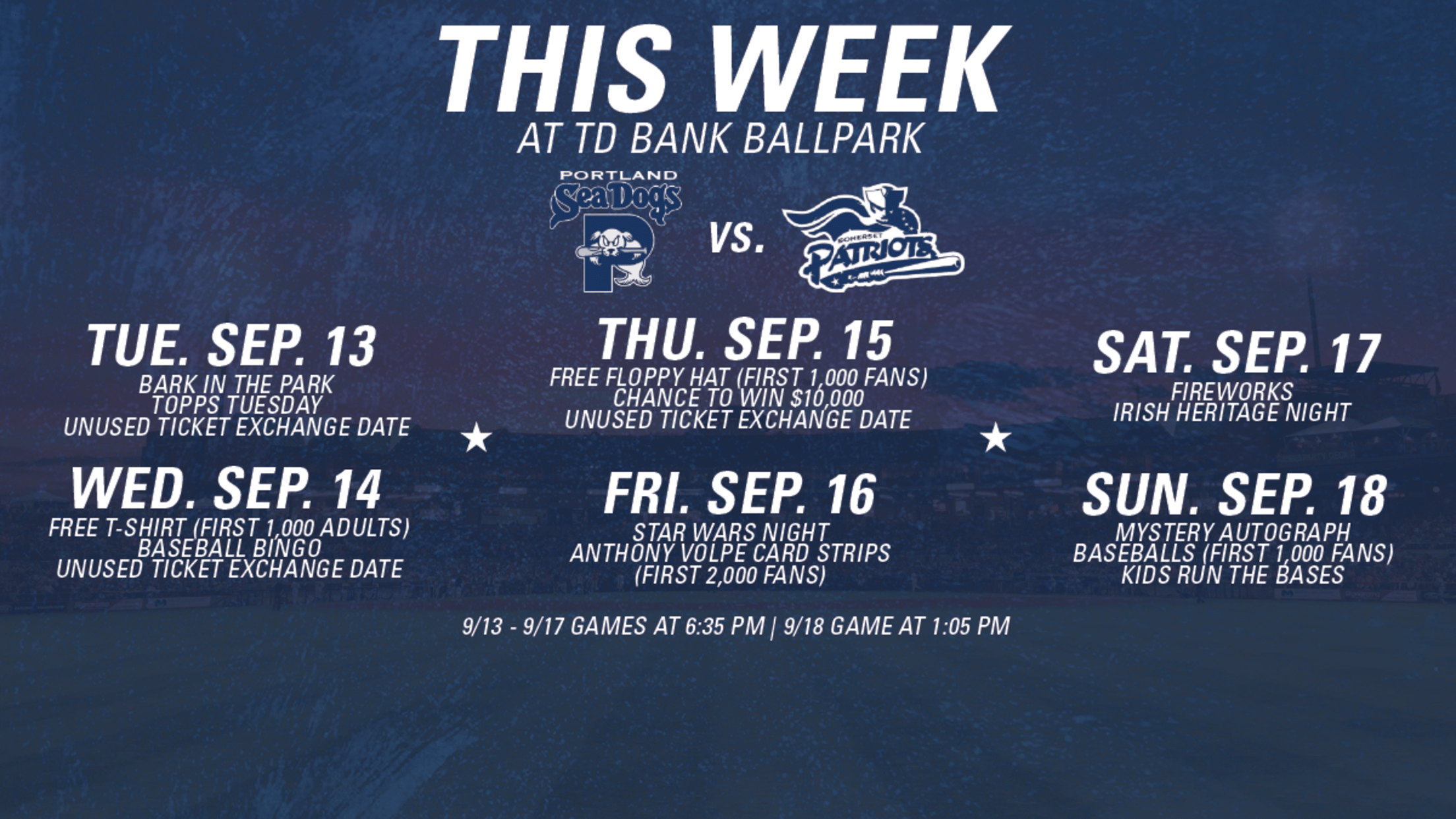 Bridgewater, New Jersey – The Somerset Patriots return home for the final home stand of the regular season from Tuesday, September 13 – Sunday, September 18. The Patriots take on the Portland Sea Dogs (Boston Red Sox) as they get ready for their first postseason appearance as the Yankees Double-A affiliate.