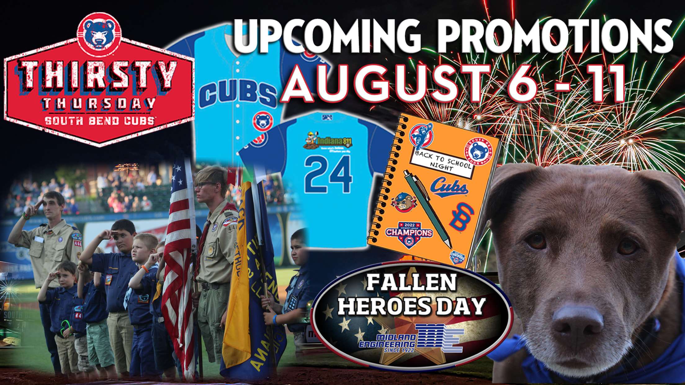 South Bend Cubs Replica Jersey Giveaway, a new Corporal Paul Deguch Community Service Award Winner, and Two Fireworks Shows Headline Four Winds Field This Week