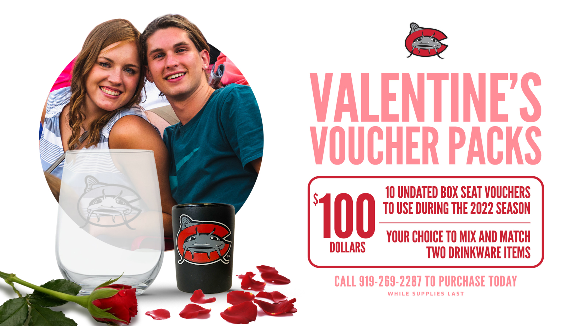 ZEBULON - Valentine’s Day is coming up and the Carolina Mudcats have a fun new gift and ticket package available for fans looking to celebrate their loved ones with baseball fun at Five County Stadium. The Mudcats’ Valentine’s Day Voucher Pack is $100 and includes a 10-pack of undated ticket vouchers and either two wine glasses, two shot glasses, or a combination of both (one wine glass and one shot glass).